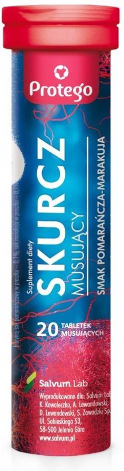 Protego Skurcz Musujący Suplement diety  SMAK POMARAŃCZA- MARAKUJA Protego Skurcz Musujący to suplement diety w postaci tabletek musujących o smaku pomarańcza-marakuja zawierający MAGNEZ oraz POTAS, które wspierają prawidłowe funkcjonowanie mięśni.  Ponadto produkt zawiera 5 najważniejszych witamin z grupy B. Produkt przeznaczony jest dla osób dorosłych. 20 tabletek musujących SKŁAD: Zawartość składnika w przeliczeniu na zalecaną porcję dzienną- 1 tabletka: Opakowanie: 20 tabletek musujących. Zawiera substancje słodzące. Składniki: Regulator kwasowości: kwas cytrynowy; diwęglan potasu; węglan magnezu; substancja wypełniająca: sorbitole; regulator kwasowości: węglany sodu; aromaty; substancje przeciwzbrylające: poliwinylopirolidon, glikol polietylenowy; barwnik: karoteny; koncentrat soku buraka czerwonego w proszku; substancje słodzące: cyklaminiany, sacharyny; amid kwasu nikotynowego; cyjanokobalamina; chlorowodorek pirydoksyny; chlorowodorek tiaminy; D-biotyna; sok pomarańczowy w proszku - 0,1%; sok marakuja w proszku - 0,1%. PRZEZNACZENIE: Preparat przeznaczony dla osób dorosłych w sytuacjach zwiększonego zapotrzebowania na magnez, potas oraz witaminy z grupy B. Magnez i Potas pomagają w prawidłowym funkcjonowaniu układu nerwowego i mięśni. Tiamina i Biotyna pomagają w prawidłowym funkcjonowaniu układu nerwowego. Niacyna pomaga w utrzymaniu prawidłowych funkcji psychologicznych. Witamina B6 i B12 przyczyniają się do zmniejszenia uczucia zmęczenia i znużenia. JAK STOSOWAĆ: Zalecane dzienne spożycie: Zaleca się spożywać 1 tabletkę dziennie.  Tabletkę należy rozpuścić w szklance (200 ml) chłodnej wody. Nie należy przekraczać zalecanej porcji do spożycia w ciągu dnia. Suplement diety nie może być stosowany jako substytut zróżnicowanej diety. Zrównoważona dieta i zdrowy tryb życia są istotne dla zachowania zdrowia. Ostrzeżenie: Nie należy stosować w przypadku nadwrażliwości na którykolwiek ze składników preparatu. Kobiety w okresie ciąży i karmienia piersią stosowanie produktu powinny skonsultować z lekarzem. DODATKOWE INFORMACJE: Opakowanie Protego Skurcz Musujący zawiera 20 tabletek musujących. Przechowywać w suchym miejscu w temperaturze poniżej 250C. Przechowywać w sposób niedostępny dla małych dzieci. Chronić przed światłem.  Najlepiej spożyć przed: data i numer partii znajduje się na spodzie tuby. Masa netto: 84 g          (20 tabletek po 4,2 g) Wyprodukowano w Polsce dla:  Salvum Lab K. Kowaleczko, A. Lewandowski, D. Lewandowski, S. Zawadzki Sp. k.,  ul. Sobieskiego 53, 58-500 Jelenia Góra,  www.salvum.pl