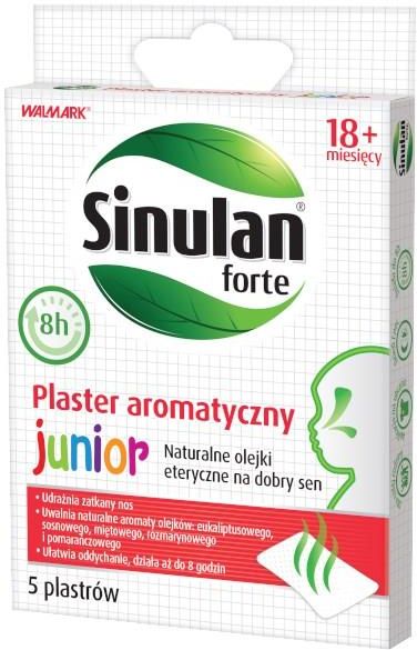 Sinulan Forte Junior - plaster aromatyczny, 5 sztuk Sinulan Forte Junior w formie aromatycznego plastra, dzięki olejkom eterycznym ułatwia oddychanie. Charakterystyka Sinulan Forte Junior to plaster aromatyczny ułatwiający oddychanie przeznaczony do stosowania u dzieci powyżej 18. miesiąca życia. Zawarte w produkcie naturalne składniki stopniowo uwalniają aromatyczne olejki eteryczne takie jak olejek sosnowy, który posiada właściwości kojące, olejek eukaliptusowy wspomagający oddychanie oraz odświeżający olejek miętowy. Preparat powoduje zwężanie naczyń krwionośnych w jamie nosowej, zmniejszając produkcję kataru i udrażniając drogi oddechowe, dzięki czemu łagodzi dyskomfort wynikający z zatkanego nosa. Plastry można stosować w dzień i na noc, działają do 8 godzin. Zastosowanie Dyskomfort związany z zatkanym nosem u dzieci. Sposób użycia Usunąć warstwę zabezpieczającą plaster i umieścić bezpośrednio w okolicy klatki piersiowej na ubraniu. Eteryczne działanie naturalnych aromatów wydzielanych przez plaster utrzymuje się przez 6-8 godzin. Przeciwwskazania: Nie stosować u osób z rozpoznaną alergią na olejki eteryczne ani u chorych na astmę. Nie stosować też u dzieci poniżej 18. miesiąca życia. Ważne informacje Chronić przed bezpośrednim działaniem promieni słonecznych. Przechowywać w chłodnym i suchym miejscu w szczelnie zamkniętym pojemniku w temperaturze pokojowej. Nie umieszczać opakowania w miejscu dostępnym dla dzieci i niemowląt. Plastry przeznaczone są do jednorazowego użytku. Po użyciu wyrzucić. Unikać kontaktu z oczami, błonami śluzowymi i ranami na skórze. Nie przechowywać w temperaturze powyżej 30 stopni Celsjusza. Producent WALMARK Sp. z o.o. To jest wyrób medyczny Produkt ma wdrożony certyfikat CE Etykieta informacyjna / instrukcja obsługi znajduje się w opakowaniu wyrobu medycznego jest wydana w języku polskim Informacje zawarte na opakowaniu są w języku polskim Posiada deklarację zgodności UE Produkt należy stosować zgodnie z jego przeznaczeniem opisanym na opakowaniu i/lub ulo