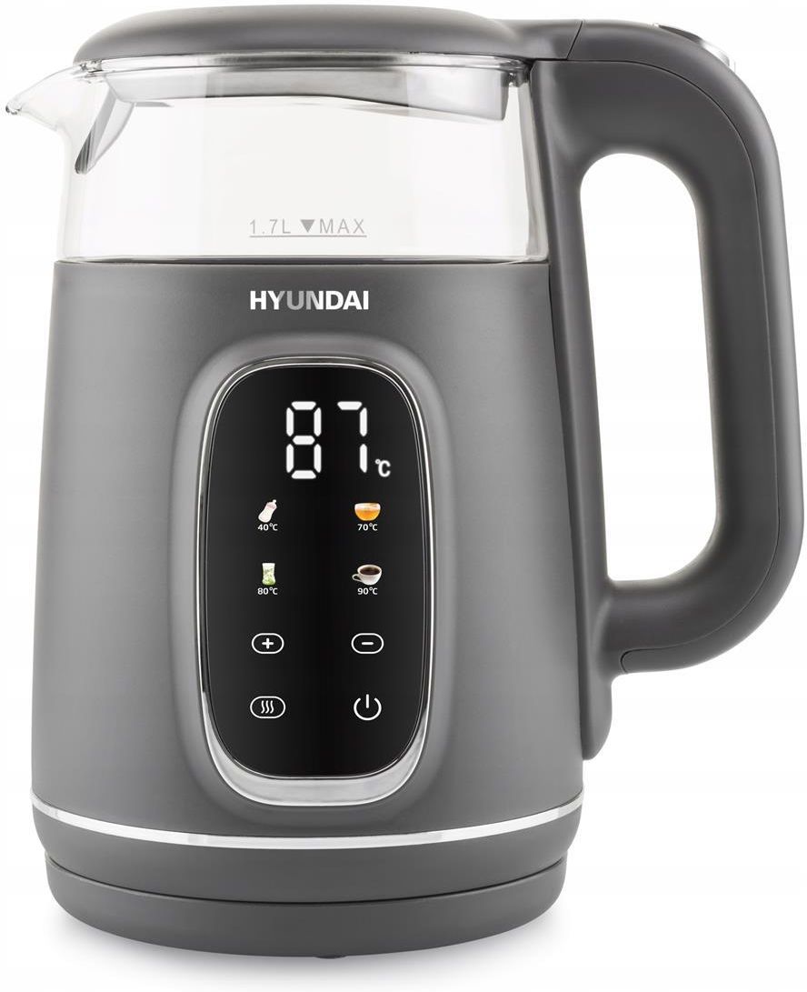 AGD-PERFEKT prezentuje Czajnik elektryczny HYUNDAI VK-670 czarny z podwójnymi ściankami i regulacją temperatury Niezbędnym elementem w każdej domowej lub biurowej kuchni jest dobrej jakości czajnik, który szybko gotuje wodę, a jednocześnie jest modnym elementem wyposażenia kuchni. Dwuściankowy czajnik elektryczny Hyundai VK670 z pojemnością 1,7 l, wysoką mocą 2200 W oraz płynną regulację temperatury w zakresie 40–100°C. Dzięki dwuściankowej konstrukcji znacząco zmniejsza ryzyko poparzenia. Ponadto, posiada czytelny wyświetlacz LED z prezentacją aktualnej temperatury, sterowaniem dotykowym oraz funkcją KEEP WARM do utrzymywania ustawionej temperatury. Komfort użytkowania zwiększają funkcje automatycznego wyłączania, potrójnego systemu bezpieczeństwa, ukryta grzałka oraz sygnalizacja dźwiękowa. Zalety Podwójne ścianki: konstrukcja dwupłaszczowa znacznie zmniejsza ryzyko poparzenia Wyświetlacz LCD: wskazuje temperaturę wody w czajniku przed i w trakcie gotowania Funkcja wyświetlania temperatury wody Płynna regulacja temperatury: 40–100°C (co 5 °C) do różnych rodzajów napojów Funkcja KEEP WARM: podtrzymywania ciepła do ok 120 min. Funkcja pamięci: dla funkcji utrzymywania temperatury Przyciski funkcyjne, programy automatyczne: 40°C - pokarmy dziecięce 70°C - herbata zielona, Gyokuro Hoshino lub puree dziecięce 80°C - herbata biała, Yerba Mate 90°C - herbaty oolong, kawa, napoje instant, zupy Dane urządzenia Podwójne ścianki: wewnętrzny korpus wykonany ze szkła, zewnętrzny korpus wykonany z plastiku Moc: 2200 W Pojemność: 1,7 litra Wyświetlacz LED: z informacją o temperaturze Wbudowany przejrzysty wyświetlacz LED Pokrywa otwierana przyciskiem: łatwe otwieranie Pokrywka na zawiasach: pozwala uniknąć kontaktu z parą podczas otwierania czajnik Automatyczne wyłączenie po zagotowaniu Potrójny system bezpieczeństwa: Zabezpieczenie przed przegrzaniem Zabezpiecza przed włączeniem pustego czajnik Odłączenie po wyjęciu z podstawy Możliwość napełniania przez dziobek lub pokrywkę Płaski element grzejny: umożliwia szybkie gotowanie i łatwe czyszczenie Ergonomiczny uchwyt Bezprzewodowy, obrotowa podstawa: wygodna dla osób prawo i leworęcznych Uchwyt do nawijania przewodu sieciowego: pozwala go zwinąć lub skrócić do wymaganej długości Sygnalizacja dźwiękowa Lampka kontrolna Stopy antypoślizgowe Dane techniczne Moc: 1850-2200 W Napięcie 220–240 V Częstotliwość 50–60 Hz Pojemność: 1,7 l Długość przewodu: 0,75 m Materiał wykonania: szkło / plastik Wymiary produktu (WxSxG): 25,5 x 21,8 x 16,5 cm Wymiary opakowania (WxSxG): 25,3 x 21,0 x 18,0 cm Waga netto/brutto: 1,17 / 1,38 kg Kolor: Szary W zestawie Czajnik Oryginalne opakowanie Instrukcja obsługi Karta gwarancyjna