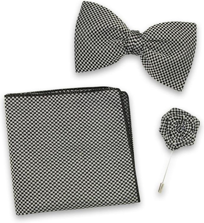 Komplet składający się muchy męskiej, poszetki i szpilki do marynarki we wzór w czarno-białą kratkę