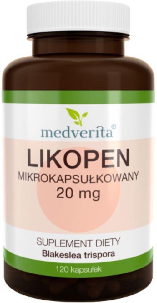 Zawiera 20 mg czystego likopenu w jednej kapsułce Likopen pozyskiwany z fermentującego grzyba Blakeslea trispora Ekstrakt standaryzowany na 5% zawartości likopenu Bez zbędnych dodatków – brak wypełniaczy, konserwantów, substancji powlekających i poślizgowych Opakowanie zawiera: 120 kapsułek Likopen 20 mg Medverita 120 kaps Likopen 20 mg Medverita to suplement diety zawierający wysokiej jakości, naturalny likopen – roślinny barwnik z grupy karotenoidów. Związek ten naturalnie występuje w wielu owocach i warzywach, nadając im charakterystyczną czerwoną barwę. W przyrodzie pełni również funkcję neutralizującą wolne rodniki. W preparacie wykorzystano likopen otrzymywany w procesie fermentacji grzyba Blakeslea trispora . Dzięki temu uzyskano składnik aktywny pochodzenia naturalnego, poddany dodatkowo mikroenkapsulacji – technologii, która wspomaga jego stabilność i trwałość w gotowym produkcie. Każda kapsułka zawiera 20 mg czystego likopenu, pozyskiwanego z ekstraktu standaryzowanego na 5% zawartości substancji aktywnej. Suplement dostępny jest w formie żelatynowych kapsułek, w opakowaniu zawierającym 120 porcji dziennych. Masa netto wynosi 66 g, a każda kapsułka to 400 mg. Dzięki wysoce skoncentrowanej formule,Likopen 20 mg stanowi praktyczne i proste rozwiązanie dla osób, które chcą uzupełnić swoją dietę w naturalny składnik roślinny o znanym pochodzeniu i czystym składzie.