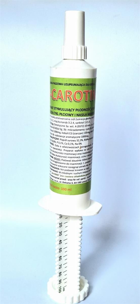 PBN B-Carotin Gel z karotenem Wskazania: słaba skuteczność inseminacji ciche i nieregularne ruje brak rui Właściwości: zioła o właściwościach estrogennych , mikroelementy, witaminy oraz beta karoten ograniczają wystąpienie zaburzeń w reprodukcji preparat wpływa na cykl hormonalny, przyczynia się do wystąpienia wyraźnych objawów rui i zwiększenia skuteczności inseminacji oraz implantacji zarodków Stosowanie: Podawać doustnie 100 ml preparatu na 2 do 4 tygodni przed inseminacją. Poporodowe przygotowanie do inseminacji: pierwsze podanie 2-4 tygodnie po porodzie, drugie podanie 2-4 tygodnie przed inseminacją Przed zastosowaniem wskazane jest zasięgnięcie porady lekarza weterynarii lub specjalisty do spraw żywienia. Skład: produkty przetwarzania ziół (lukrecja gładka, imbir) gliceryna roślinna glikol propylenowy mączka karob sorbitol Dodatki na kg: witamina A 10 mln j. m. witamina D 3 2,5 mln j.m. witamina E 25 g niacyna 5 g beta-karoten 5 g cynk 25 g mangan 11 g mied x 6 g jod 1000 mg kobalt 105 mg selen 90 mg sorbinian potasu 1000 mg substancje aromatyczne 1000 mg Skład analityczny: popiół surowy 32,2 % białko surowe 1,1 % oleje i tłuszcze surowe 0,01 % włókno surowe 1,5 % wilgotność 28,8 % P 0,1 % Ca 0,1 % Na 0 % Przeciwwskazania: Nie podawać krowom w ciąży. Pojemność: 100 ml Producent: PBN