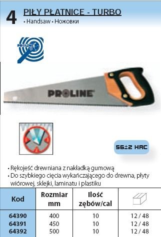 64390 Pia patnica Turbo 400mm 10TPI, Proline Uzbienie hartowane indukcyjnie 56 +/- 2HRC Rkoje drewniana z nakadk gumow Do szybkiego cicia wykaczajcego do drewna, pyty wiórowej, sklejki, laminatu i plastiku Dugo: 400 mm Ilo zbów na cal: 10 (TPI)