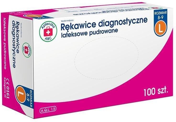 Opis: Apteczka ABC Rękawice diagnostyczne lateksowe pudrowane L do ochrony dłoni Apteczka ABC Rękawice diagnostyczne lateksowe pudrowane to wyrób medyczny do stosowania w celu ochrony dłoni przed substancjami chemicznymi, mikroorganizmami i wirusami. Produkt jednorazowego użytku..Skład: Rękawice wykonane z naturalnego lateksu kauczukowego..Charakterystyka produktu: Wykonane z naturalnego lateksu kauczukowego. Stanowią ochronę w zakresie ryzyka związanego z patogenami krwiopochodnymi. Ochrona o wysokim stopniu elastyczności. Pozwalają zminimalizować ryzyko zakażeń. Wytrzymałe i elastyczne. Biodegradowalne ze względu na użycie naturalnego surowca. Wyrób odpowiedni do kontaktu z żywnością. Wyrób jednorazowego użytku. Rozmiar L (8-9) .Sposób użycia: Przed użyciem należy sprawdzić, czy rękawice nie mają wad lub uszkodzeń oraz czy nie noszą śladów użytkowania. Odporność rękawic na czynniki chemiczne może ulec zmniejszeniu w trakcie ich stosowania. Przed użyciem należy sprawdzić, czy rękawice są odpowiednie do planowanego zastosowania, ponieważ warunki w miejscu pracy mogą różnić się od warunków testowania w zależności od czynników takich jak temperatura, ścieranie i degradacja. Ścieranie należy traktować jako główny czynnik brany pod uwagę przy wyborze rękawic używanych do pracy ze żrącymi substancjami chemicznymi. Degradacje lub tarcia spowodowane kontaktem z substancjami chemicznymi mogą znacząco skrócić rzeczywisty czas eksploatacji. Używać przez ograniczony czas. Przechowywać w suchym miejscu, z dala od bezpośredniego światła słonecznego..Zawartość opakowania: 100 sztuk.Dodatkowe: ODPORNOŚĆ CHEMICZNA: Odporność na czynniki chemiczne została oceniona w warunkach laboratoryjnych i dotyczy wyłącznie testowanych substancji chemicznych. Może się różnić od przedstawionej, jeśli substancja chemiczna jest stosowana w mieszaninie. ODPORNOŚĆ NA PRZENIKANIE SUBSTANCJI CHEMICZNYCH: Odporność na przenikanie została oceniona w warunkach laboratoryjnych i odnosi się wyłącznie do testowanych substancji chemicznych. RĘKAWICE ZAPEWNIAJĄ OCHRONĘ PRZED: substancjami chemicznymi (Typ C: wodorotlenek sodu 40%: poziom 2), mikroorganizmami i wirusami..Ostrzeżenia: To jest wyrób medyczny. Używaj go zgodnie z instrukcją używania lub etykietą. Wyrób produkowany z naturalnego lateksu kauczukowego - może powodować reakcje alergiczne, w tym również reakcje anafilaktyczne..