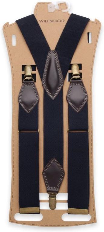 Klasyczne granatowe szelki męskie z zapięciem na żabki i brązowymi wykończeniami
