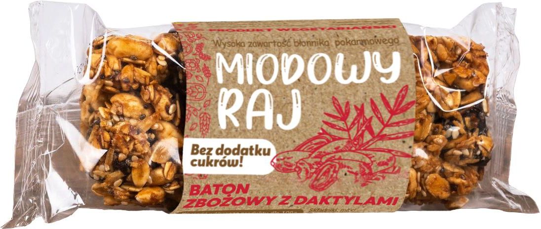 Baton zbożowy Miodowy Raj z daktylami jest bez dodatku cukrów i jest naturalnym źródłem błonnika pokarmowego. Składniki: Miód wielokwiatowy (30,2%), płatki owsiane (17,6%), daktyle suszone (15,5%) (daktyle, mąka ryżowa), migdały, mleko, wiórki kokosowe, ryż preparowany, mleko pełne w proszku, ziarna sezamu, szałwia hiszpańska chia, cynamon, imbir, propolis. Może zawierać orzechy arachidowe. 100 g produktu zawiera: wartość energetyczna 1681 kJ/ 400 kcal, tłuszcz 14 g, w tym tłuszczowe kwasy nienasycone 5,4 g, węglowodany 54 g, w tym cukry 38 g, błonnik 6,8 g, białko 8,2 g, sól 0,08 g Masa netto: 45 g Przeciwwskazania: Uczulenie na którykolwiek ze składników. Przechowywanie: Przechowywać w suchym i chłodnym miejscu. Producent: Gospodarstwo Pasieczne Tomasz Łysoń Sp. z o.o. Sp. Komandytowa 34-124 Klecza Górna, ul. Klecza Dolna 338b