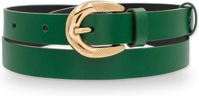 Zielony, skórzany pasek damski ze złotą, półokrągłą klamrą