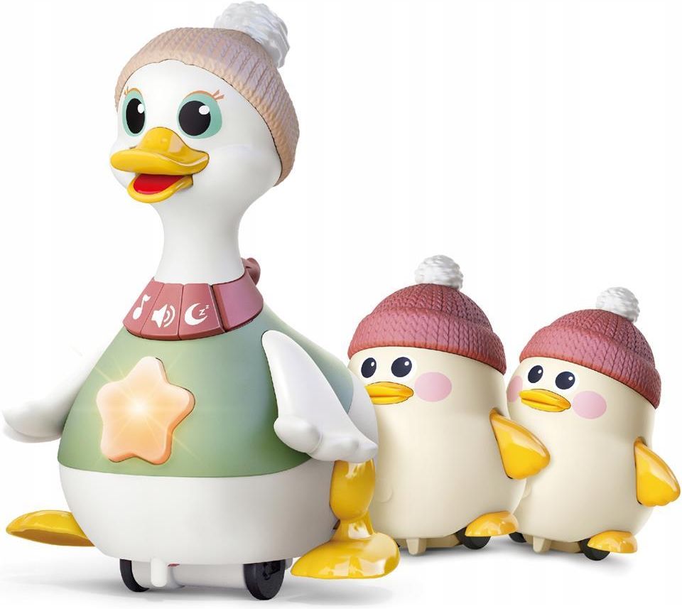 KACZKA MONIKA Z MALUCHAMI Poznaj uroczy zestaw KACZKA MONIKA Z MALUCHAMI – idealną zabawkę edukacyjną dla najmłodszych! Ta interaktywna kaczka jeżdżąca i śpiewająca po polsku to nie tylko źródło wspaniałej zabawy, ale także rozwój sensoryczny i muzyczny dziecka. W zestawie znajdziesz dużą mamę kaczkę oraz dwie słodkie małe kaczuszki, które można ze sobą łączyć na różne sposoby – jeżdżą razem "gęsiego" lub tańczą, obracając się wokół własnej osi. Cechy produktu - zabawka śpiewa po polsku; - duża kaczka działa w trybie statycznym (STOP) lub dynamicznym (GO); - kaczka jeździ do przodu przy dźwiękach melodii, a dzięki wbudowanym magnesom, można przyczepić do niej jej dzieci – małe kaczuszki, aby cała rodzinka podążała za sobą gęsiego; - duża kaczka posiada świecący przycisk (gwiazdka) i 3 przyciski: melodie, regulacja głośności, kołysanki; - każda z kaczek może poruszać się oddzielnie; - małe kaczuszki można połączyć ze sobą skrzydełkami, aby obracały się dookoła, tańcząc w ten sposób ze sobą lub ustawić je obok siebie, łącząc je skrzydełkami, aby poruszały się przed siebie, „trzymając się” za skrzydełka; - wiek: 6m+. Zestaw zawiera 1x duża kaczka Monika 2x małe kaczuszki Baterie do dużej kaczki (3x AA w zestawie) Brak baterii AAA do małych kaczek. Szukasz prezentu dla maluszka? KACZKA MONIKA Z MALUCHAMI to strzał w dziesiątkę! Spraw radość dziecku i ciesz się jego śmiechem i zabawą każdego dnia!