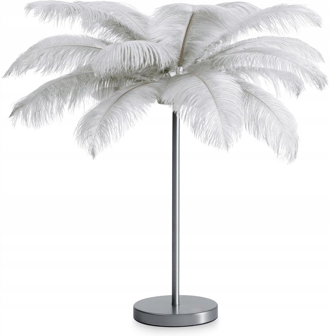Przedmiotem oferty jest lampa stołowa. Lampa stołowa FERI zauroczy klientów poszukujących niezwykle efektownych dodatków do dekoracji wnętrz. Swój wyjątkowy charakter zawdzięcza niezwykłemu designowi. Wysmukłą metalową podstawę w kolorze srebrnym nakryto abażurem z naturalnych strusich piór. Pióra nadają wnętrzu efektownego wyglądu, a także tworzą przyjemne efekty świetlne, gdy lampa jest włączona. Znakomicie sprawdzi się we wnętrzu w stylu glamour, w stylu retro, art deco. Wymiary: Wysokość lampy z piórami - 68 cm, Średnica abażura - 65 cm, 3 x żarówka E14 - wyłącznie LED 5 W (nie znajduje się w zestawie), zasilanie: CE 220-240V 50 Hz. Kolor: srebrny. Skład: metal, pióra. Dokładamy największej staranności podczas robienia zdjęć oferowanego towaru, jednak w rzeczywistości kolor oraz odcień może się minimalnie różnić od widocznego na różnego rodzaju monitorach.