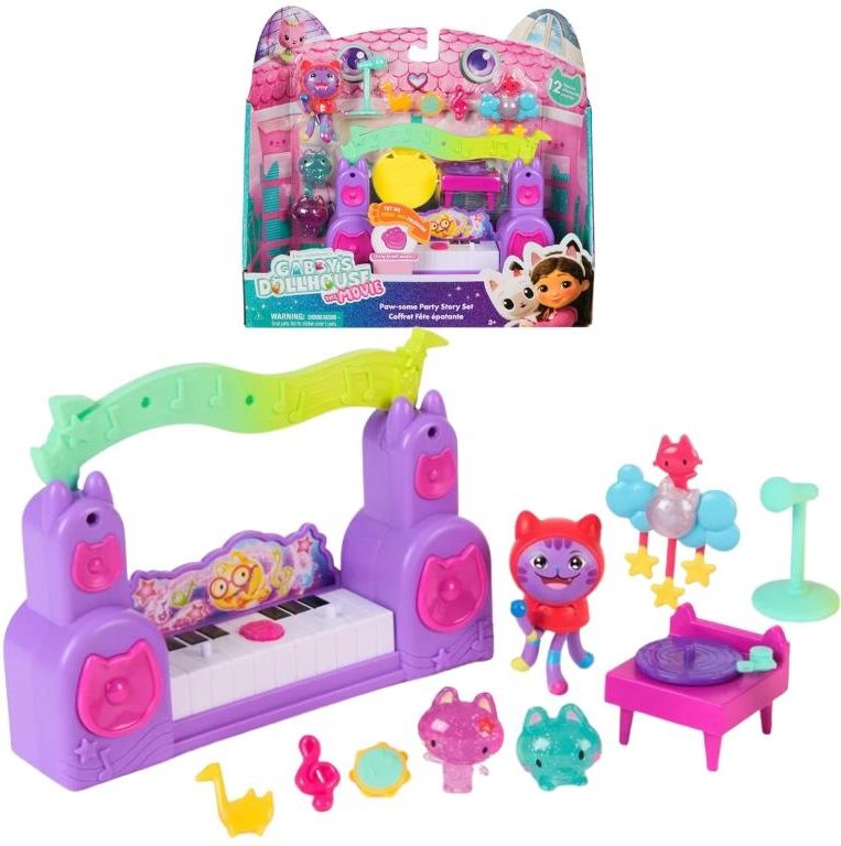 Koci Domek Gabi Film Zestaw Muzyczna Impreza Producent: Spin Master Wiek: 3+ Zabawka ta powstała na podstawie serialu dla dzieci pod tytułem Koci Domek Gabi Rozkręć miau-giczną imprezę z Gabi i DJ-em Kocimiętką! Przenieś się do kolorowego świata Kociego Domku Gabi i poczuj rytm najlepszej imprezy w mieście! Zestaw Muzyczna Impreza od Spin Master to pełne energii miejsce, w którym urocze kotki i Gabi bawią się przy dźwiękach muzyki. W komplecie czeka uśmiechnięty DJ Kocimiętka, dwie błyszczące figurki Gumikotków oraz mnóstwo imprezowych akcesoriów – głośniki w kocim stylu, konsola DJ-a, mikrofon i lśniąca kula dyskotekowa. Wystarczy nacisnąć klawisz fortepianu, aby uruchomić magiczny przycisk i usłyszeć muzyczną zabawę prosto z serialu! Magia muzyki i kreatywnej zabawy Kręć konsolą, rozkołysz kulę dyskotekową i pozwól, by imprezowy klimat opanował cały domek! Zestaw zachęca do tworzenia własnych historii, rozwijając wyobraźnię i kreatywność. Nie zabrakło też charakterystycznej przesyłki-niespodzianki, którą możesz otworzyć tak, jak robi to Gabi w animacji. Muzyczną Imprezę można ustawić w Domku Gabi (sprzedawanym osobno), np. na stryszku, i połączyć z innymi zestawami z serii, tworząc rozbudowany świat zabawy. Dane techniczne i produktowe Produkt: Koci Domek Gabi – Muzyczna Impreza Wymiary stanowiska muzycznego: ok. 15 × 4 × 11 cm Wysokość figurki DJ Kocimiętka: ok. 5,5 cm Wysokość figurki Gumikotków: ok. 3 cm Wiek: 3+ Zawartość zestawu 1 × stanowisko muzyczne z fortepianem, konsolą i głośnikami 1 × figurka DJ Kocimiętka 2 × figurka brokatowego Gumikotka 8 × imprezowy gadżet 1 × przesyłka-niespodzianka Największe zalety produktu Oficjalny zestaw inspirowany filmem Gabby’s Dollhouse: The Movie (2025) Interaktywne elementy – fortepian z przyciskiem, obracana konsola, kula dyskotekowa Możliwość połączenia z innymi zestawami i domkiem Gabi Wysoka jakość wykonania i wierne odwzorowanie postaci z bajki Kreatywna zabawa rozwijająca wyobraźnię Zabawa, która gra w rytmie kociej muzyki! Ten zestaw to doskonały prezent dla małych fanów Gabi i jej kocich przyjaciół. Pozwól dziecku rozkręcić własną muzyczną imprezę i cieszyć się magiczną atmosferą prosto z ekranu!