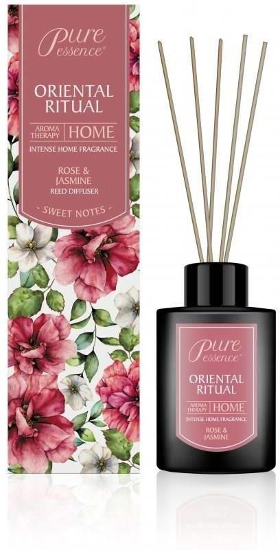 Dyfuzor Zapachowyo Oriental Ritual Pure Essence Zapachb :Oriental Ritual✨ Właściwości:☑️ Słodko-upojnie a zarazem intensywne nuty jaśminu z odurzającym i niezwykle zmysłowym zapachem róży, na bazie orientalnych i korzennych kompozycji paczuli. Sposób użycia✴️ Otwórz flakonik. Włóż patyczki do flakonika. Patyczki po nasiąknięciu esencją uwolnią przyjemny, trwały zapach. Do uzyskania silnego zapachu obrócić patyczki co kilka dni. Trwałość kilka tygodni. ZALETY❇️ Długotrwałe działanie – dyfuzor zapewnia stały zapach w pomieszczeniu przez wiele tygodni, co pozwala na utrzymanie przyjemnej atmosfery. Naturalne esencje – zawiera naturalne olejki eteryczne, które są łagodniejsze dla zdrowia i nie obciążają powietrza chemicznymi substancjami. Aromaterapia – działa relaksująco, poprawia nastrój, a nawet wspiera koncentrację, korzystając z właściwości olejków eterycznych. Elegancki design – jego stylowy wygląd może być atrakcyjnym elementem dekoracyjnym, pasującym do różnych wnętrz. Łatwa obsługa – wystarczy włożyć patyczki do flakonika z esencją, a zapach będzie stopniowo się uwalniał. Równomierne rozprowadzanie zapachu – dzięki specjalnej formule zapach rozprzestrzenia się równomiernie w pomieszczeniu. Indywidualne dostosowanie intensywności zapachu – intensywność zapachu można regulować poprzez liczbę patyczków umieszczonych w dyfuzorze.