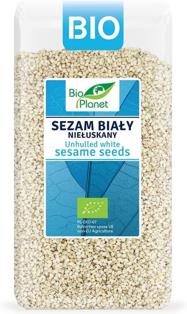 SEZAM BIAŁY NIEŁUSKANY BIO 400 g - BIO PLANET 5902425050934 SKŁADNIKI ekologiczne NASIONA SEZAMU białego niełuskanego 100 %. OPIS Polecamy jako dodatek do makaronów, zup, sałatek i przekąsek. Przed spożyciem można poddać obróbce termicznej. WARTOŚĆ ODŻYWCZA W 100 g Wartość energetyczna 2429 kJ/588 kcal Tłuszcz 50 g w tym kwasy tłuszczowe nasycone 6,8 g Węglowodany 10 g w tym cukry 0,2 g Błonnik 11 g Białko 18 g Sól 0,1 g INFORMACJA ALERGENNA Produkt może zawierać: ZBOŻA ZAWIERAJĄCE GLUTEN, ORZESZKI ZIEMNE, ORZECHY, SOJĘ. ZALECANE WARUNKI PRZECHOWYWANIA Przechowywać w suchym i chłodnym miejscu. Parametry Kraj pochodzenia: Uganda Ilość w opakowaniu zbiorczym: 1 Wysokość opakowania jednostkowego (cm): 13.00 Gwarantowany termin przydatności (w dniach): 90 Głębokość opakowania jednostkowego (cm): 5.00 Masa netto (g): 400 Szerokość opakowania jednostkowego (cm): 8.00 Bez Cukru: BEZ CUKRU (w składnikach) BEZ GLUTENU (w składnikach): BEZ GLUTENU (w składnikach) Producent: BIO PLANET - seria NIEBIESKA (ryże, kasze, ziarna) PRODUCENT / DYSTRYBUTOR - NAZWA I ADRES: BIO PLANET S.A., WILKOWA WIEŚ 7, 05-084 LESZNO WEGAŃSKI: WEGAŃSKI WEGETARIAŃSKI: WEGETARIAŃSKI Kraj pochodzenia składników (słownik BP): Uganda CERTYFIKAT BIO: CERTYFIKAT BIO