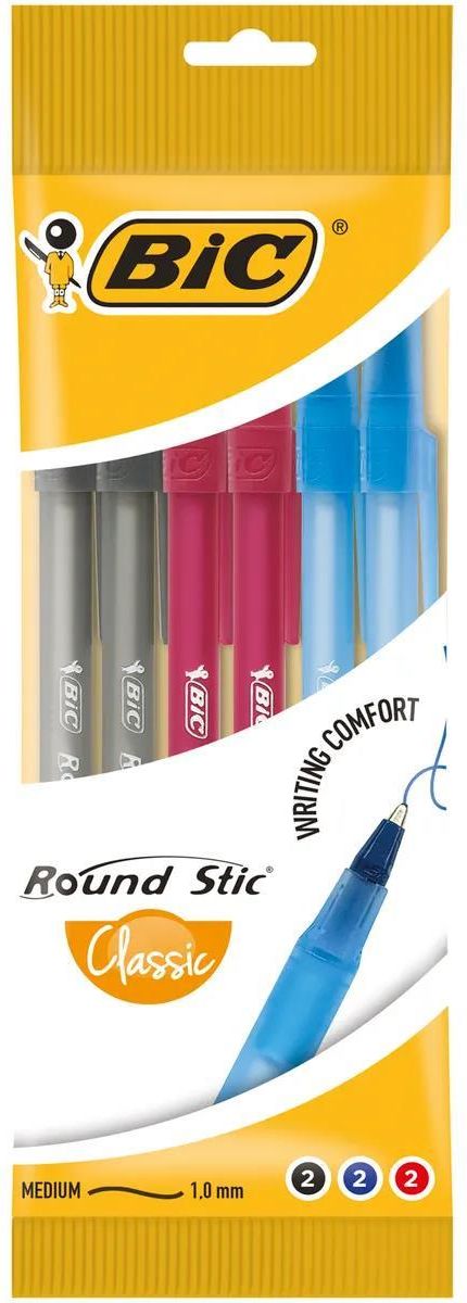 BIC Round Stic Classic długopis miks kolorów opakowanie 6 sztuk - Długopis jednorazowy dostępny w 3 kolorach: niebieskim, czarnym i czerwonym - Smukła, transparentna obudowa w kolorze tuszu - Wygoda pisania dzięki wysokiej jakości tuszu - Średnica końcówki: 1,0mm zapewnia szerokość linii pisania 0,32mm