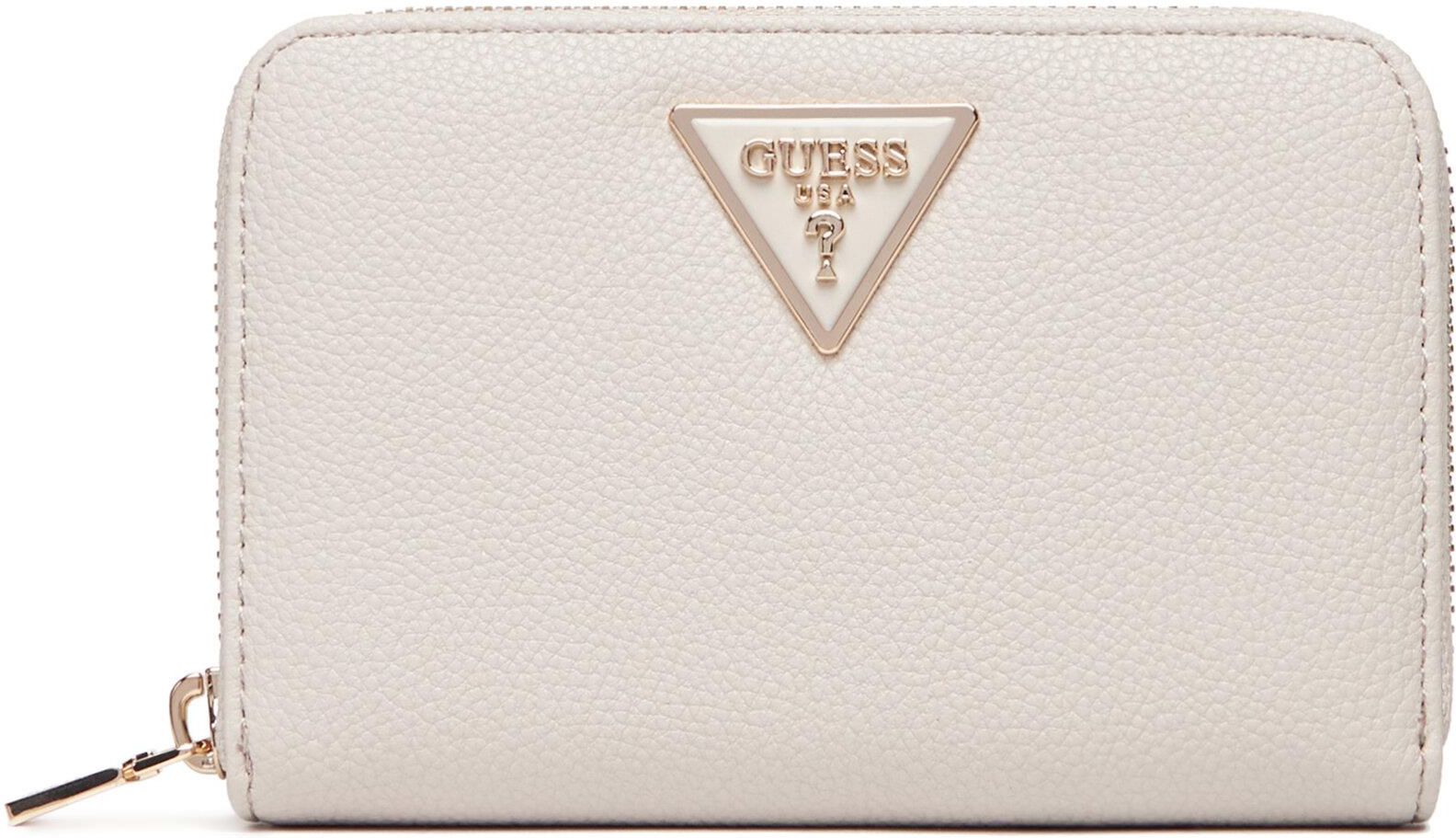 Biały portfel damski marki Guess, wykonany ze skóry ekologicznej. Zamykany na zamek, posiada wewnętrzną kieszeń na bilon, dwie przegrody, cztery miejsca na karty i dwie kieszenie wsuwane.
