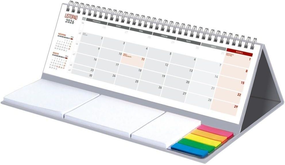Praktyczny kalendarz szkolny na biurko z przejrzystym kalendarium w układzie trzymiesięcznym. Poręczne samoprzylepne karteczki do notowania. W kalendarzu zaznaczone święta. Na tylnej części podstawki kalendarza istnieje możliwość naniesienia reklamy na obszarze o wymiarach 210 x 110 mm w formie nadruku lub naklejki. układ: trzymiesięczny kalendarium PL papier 70g/m2; biały druk granatowo bordowy format kalendarium: 204 x 99 mm format kalendarza: 210 x 192 x 112 mm ilość kart: 15 brak stopki wydawniczej foliowany pojedynczo Producent/osoba odpowiedzialna za bezpieczeństwo produktuWydawnictwo Wokółnas R. Budnik M. Kusto Spółka JawnaKozielska 18644-121 Gliwicewydawnictwo@wokolnas.pl32 331 37 16