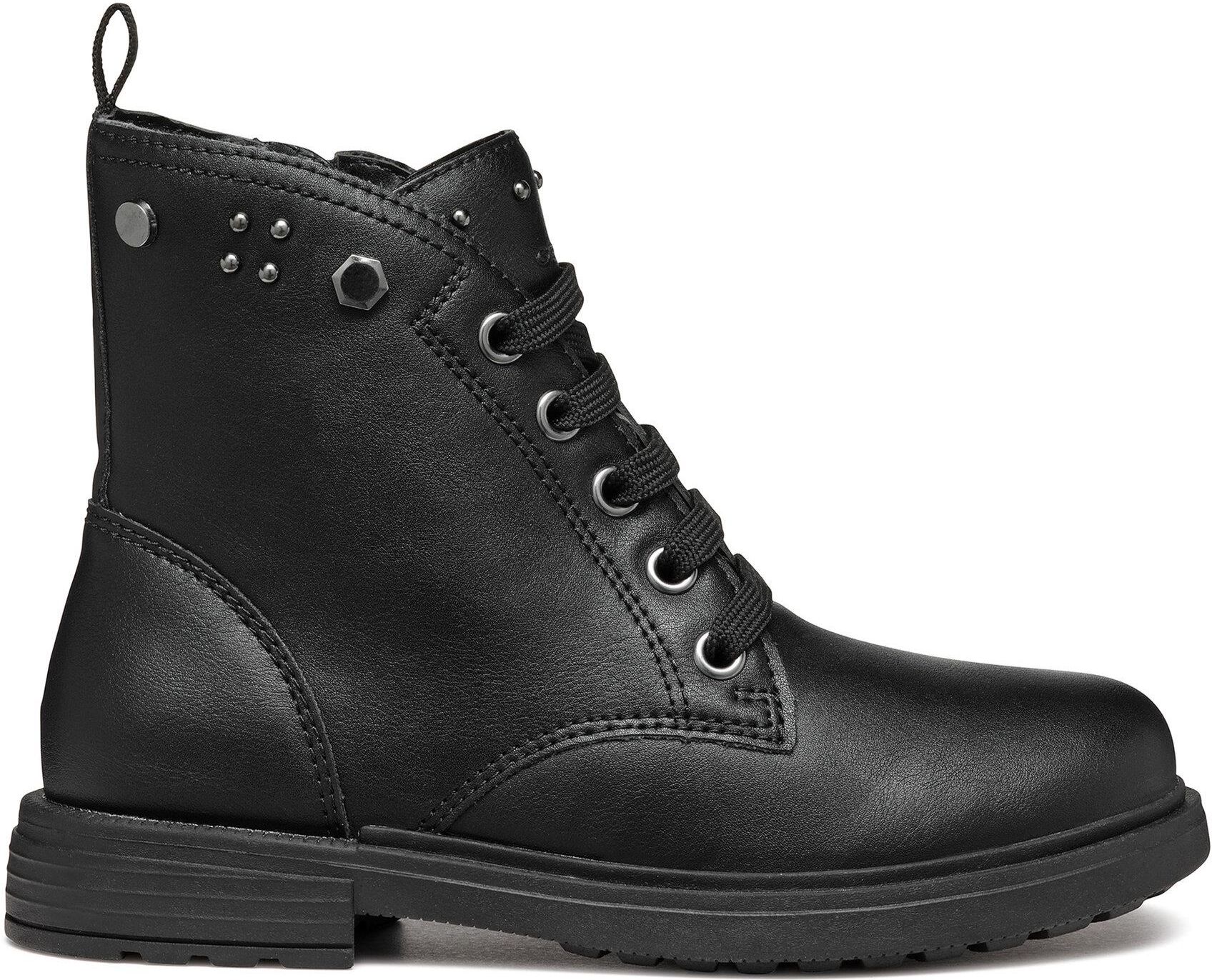 Geox Kozaki Dziewczynki Jr Eclair J169QI 0003W C9999 S czarny Dziewczęce botki Eclair w stylu vintage rock'n'roll z designem inspirowanym glanami wykończonym małymi ozdobnymi ćwiekami. Modne i wygodne w noszeniu, zostały wykonane z materiału imitującego skórę i z pewnością dodadzą energii codziennym stylizacjom.