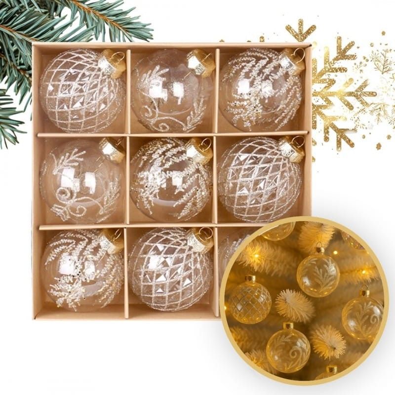 Komplet 9 sztuk bombek na choinkę Poczuj świąteczny klimat! Dodaj swojemu wnętrzu odrobinę zimowej magii. Bombki nadają się jako ozdoba świąteczna do powieszenia na oknie, choince lub jako prezent, a nawet do dekoracji stroików! Specyfikacja: Zestaw 9 sztuk Średnica bombki: 8 cm Kolor: Biały Materiał: tworzywo sztuczne Wymiary opakowania: 24,5 x 24,5 x 8 cm