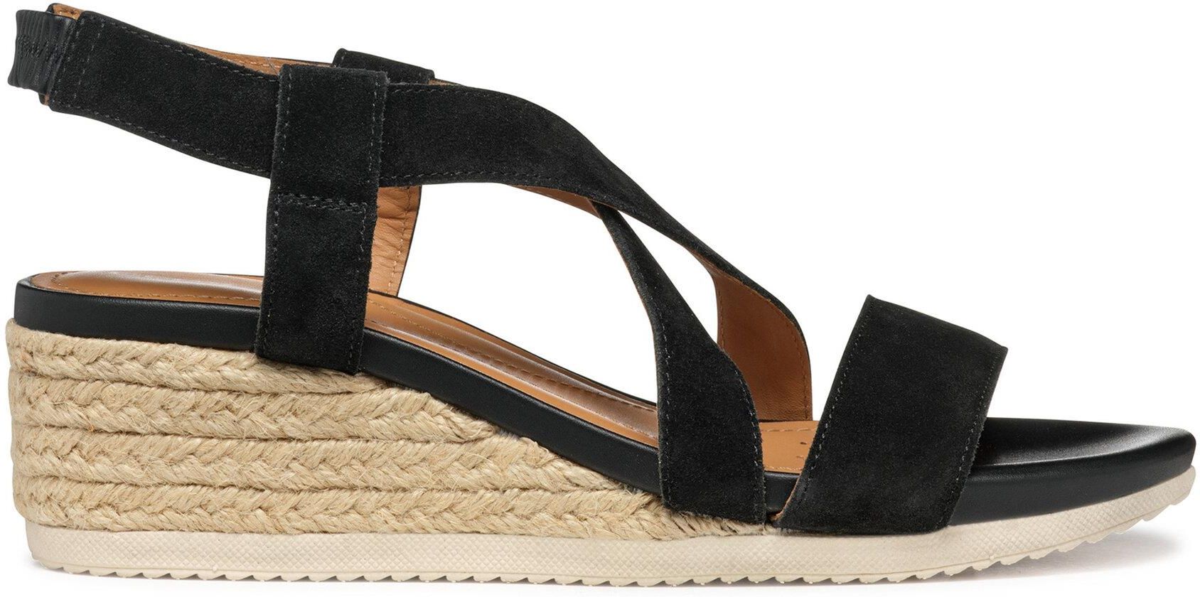 Eleganckie damskie sandały Geox Ischia Corda w czarnym kolorze zachwycają ponadczasowym designem. Charakterystyczną cechą jest przeplatający się wzór na klinowej podeszwie w beżowym odcieniu, który tworzy spektakularny wygląd espadryli. Czarne paski na podbiciu są proste i stylowe. Sandały wyposażone są w następujące technologie: Technologia Respira™ zapewnia optymalną oddychalność dzięki specjalnej membranie w podeszwie, która odprowadza wilgoć i zapobiega przedostawaniu się wody Przemyślana konstrukcja sandałów zapewnia komfort noszenia przez cały dzień. Kontrastująca brązowa wkładka dopełnia całości i zapewnia wygodny krok. Te sandały to idealny wybór na letnie dni, kiedy docenisz ich przewiewność i wygodę. Wybierz je jako stylowy dodatek do swoich letnich stylizacji.