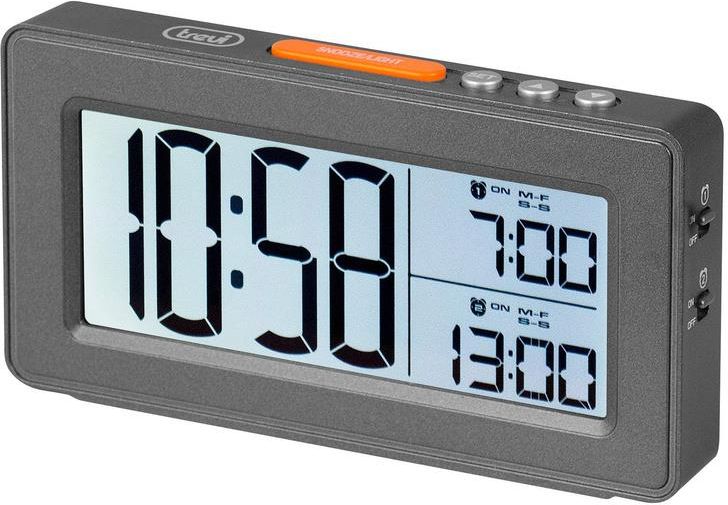 Duży wyświetlacz LCD z białym podświetleniem LED Zegar 12/24-godzinny Łatwe ustawianie alarmu za pomocą 2 przełączników bezpośrednich Bezpośrednie wyświetlanie czasu i 2 alarmów Funkcja drzemki Zasilanie: 2 baterie typu „AAA” Wymiary: 12,3 (dł.) x 2,6 (gł