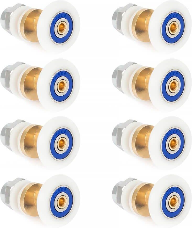 Komplet rolek mimośrodowych do kabin prysznicowych. Komplet rolek mimośrodowych do kabiny dwuskrzydłowej zawiera 8 sztuk rolek. Średnica kółka wynosi 23mm.