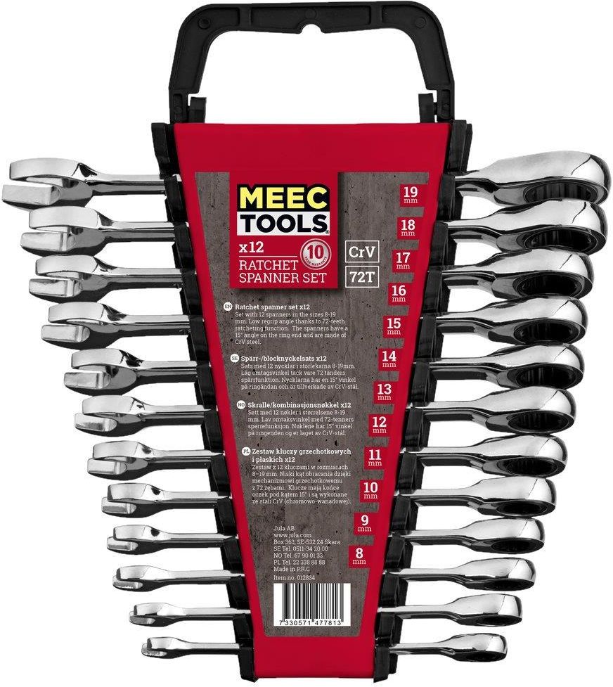 Meec Tools HT10117 Zestaw dwunastu kluczy grzechotkowych i płaskich marki MeecTOOLS wykonanych solidnie i precyzyjnie z wytrzymałej stali chromowo-wanadowej w rozmiarach 8 - 19. Klucze posiadają końce oczek pod kątem 15° i niski kąt obracania dzięki mechanizmowi grzechotkowemu z 72 zębami. Klucze dobrze leżą w dłoni i sprawdzą się idealnie podczas wielu prac w warsztacie, garażu czy domu.  Specyfikacja: Mechanizm grzechotkowy z 72 zębami Rozmiary: 8 - 19 mm Produkt wykonany ze stali chromowo-wanadowej Wykończenie: połysk Wysoka jakość wykonania W praktycznym zamykanym etui