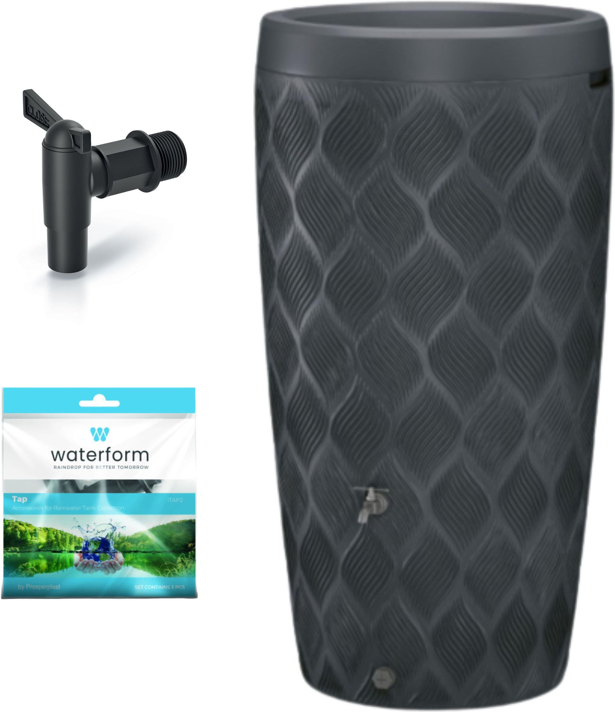 Zbiornik na deszczówkę Flow 240l - Antracyt + Kranik Specyfikacja beczki: średnica góry - 58 cm średnica podstawy - 44 cm średnica otworu góry - 56 cm wysokość - 113 cm pojemność - 240 l materiał - tworzywo sztuczne W skład zestawu wchodzi: Zbiornik na deszczówkę Flow 240l Pokrywa do beczki Kranik CANTAP Zbiornik wyposażony jest w: górny otwór z pokrywą, dwa otwory gwintowane na kran lub węża ogrodowego na szybkozłączkę. Kran do deszczownicy CANTAP ITAP2 Kranik CANTAP. Kranik ułatwiający dozowanie wody deszczowej. Kranik z gwintowanym otworem posiada: uszczelkę plastikową nakrętką. Uniwersalny plastikowy kran do zbiorników ozdobnych marki prosperplast. Zawór czerpalny ogrodowy z końcówką na węża. Gwint 3/4" Średnica końcówki na węża 26 mm Materiał - Tworzywo sztuczne