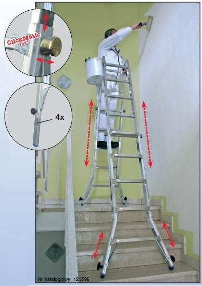 Aluminiowa drabina przegubowa TeleVario 4x5 ze szczeblami KRAUSE STABILO 133984 Drabina przegubowa teleskopowa TeleVario 4x5 STABILO 133984 to wszechstronny oraz wysokiej jakości produkt przeznaczony do użytku profesjonalnego oraz do użytku w warunkach domowych. Dzięki specjalnej konstrukcji, drabina może być wykorzystywana w różnych konfiguracjach, co pozwala na jej adaptację do szerokiego zakresu zadań. Drabina przegubowa KRAUSE 133984 może być ustawiana jako: drabina przystawna, drabina dwustronna wolnostojąca, a także wykorzystując dodatkowe wyposażenie może stanowić podest roboczy. Zastosowany w drabinie 133984 System ClickMatic umożliwia łatwą regulację wysokości, co pozwala na dostosowanie drabiny do potrzeb użytkownika, a także na ustawienie jej na schodach. Drabina przegubowa TeleVario została dodatkowo wyposażona w zintegrowany TeleSystem, który pozwala na regulację długości każdej z nóg niezależnie od siebie. Możliwość dostosowania wysokości poszczególnych elementów oraz regulacja wysunięcia nóg sprawia, że drabina przegubowa TeleVario jest niezwykle wszechstronna i sprawdzi się w miejscach gdzie zwykłe drabiny teleskopowe sobie nie poradzą. Zalety produktu Możliwość użytkowania drabiny jako: drabina przystawna drabina wolnostojąca dwustronna podest roboczy* Możliwość ustawienia drabiny przegubowej na schodach Element wewnętrzny i zewnętrzny można użytkować jako 2 osobne drabiny** Przeguby odblokowywane z pomocą dźwigni Opatentowany system regulacji wysokości ClickMatic Zintegrowany TeleSystem pozwala na regulację długości każdej nogi drabiny osobno Niewielkie wymiary po złożeniu drabiny SafetyCap - dwukomponentowe stopki zapewniające stabilność drabinie przegubowej Gwarancja 24 miesiące * Do ustawienia podestu roboczego potrzebne jest dodatkowe wyposażenie: Platforma robocza TeleBoard oraz Stabilizator CombiSystem ** Element wewnętrzny należy używać razem ze stabilizatorem CombiSystem Wymiary Ustawienie: drabina przystawna i drabina dwustronna wolnostojąca Liczba szczebli Wymiar A B C D E F G H 4x5 6,05 m 4,05 m 5,35 m 5,15 m 3,90 m 1,90 m 2,70 m 2,60 m Ustawienie: podest roboczy Liczba szczebli Wymiar A B C D 4x5 3,00 m 1,00 m 1,60 m 1,50 m Wymiary transportowe Długość L Szerokość W Wysokość H 1,60 m 0,70 m 0,25 m Szczegóły Możliwość użytkowania drabiny jako: drabina wolnostojąca dwustronna, drabina przystawna oraz podest roboczy Drabina przegubowa może być wykorzystywana jako drabina wolnostojąca dwustronna, jako drabina przystawna oraz jako podest roboczy, dzięki czemu sprawdzi się podczas wykonywania różnorodnych prac. Ustawienie drabiny KRAUSE 133984 jako drabina przystawna sprawdzi się w miejscach o ograniczonej przestrzeni lub podczas pracy na większych wysokościach. Natomiast ustawienie jako drabina wolnostojąca dwustronna umożliwia pracę tam gdzie nie ma możliwości oparcia drabiny o stabilną powierzchnię. Podest roboczy z drabiny KRAUSE 133984 pozwala na komfortowe i bezpieczne wykonywanie prac wymagających większej przestrzeni roboczej, takich jak malowanie, prace remontowe czy układanie instalacji. Do ustawienia podestu roboczego wymagany jest stabilizator CombiSystem oraz platforma robocza TeleBoard. Dodatkowe wyposażenie dostępne jest w naszych ofertach: Kup teraz: Teleskopowa platforma robocza TeleBoard 123701 Kup teraz: Teleskopowa platforma robocza TeleBoard 123718 Kup teraz: Stabilizator CombiSystem 121417 Możliwość ustawienia drabiny przegubowej na schodach Drabina przegubowa, dzięki swojej konstrukcji może być z dopasowywana do nierównych powierzchni. Umożliwia to ustawienie obu stron drabiny na różnych poziomach, bez konieczności poszukiwania dodatkowego wsparcia czy wyrównywania powierzchni. Element wewnętrzny i zewnętrzny można użytkować jako 2 osobne drabiny Przemyślana konstrukcja przegubowej drabiny KRAUSE 133984 umożliwia łatwe rozłączenie jej segmentów, tworząc dwie niezależne drabiny. Takie rozwiązanie konstrukcyjne znacząco zwiększa wszechstronność drabiny, pozwalając na jednoczesne wykonywanie różnych zadań przez dwóch użytkowników, co znacząco podnosi efektywność pracy zespołowej. UWAGA: Element wewnętrzny należy używać razem ze stabilizatorem CombiSystem. Stabilizator dostępny jest w naszych ofertach: Kup teraz: Stabilizator CombiSystem 121417 Przeguby odblokowywane z pomocą dźwigni Dźwignia do odblokowania przegubu umożliwia płynne i bezpieczne przestawienie przegubowej drabiny KRAUSE 133984 w pożądane ustawienie, eliminując potrzebę skomplikowanych manipulacji czy użycia siły. Dzięki temu proces rozkładania i składania drabiny jest szybki i bezproblemowy, co przekłada się na oszczędność czasu i redukcję zmęczenia użytkownika. Opatentowany system regulacji wysokości ClickMatic Dzięki systemowi ClickMatic, regulacja wysokości drabiny przegubowej KRAUSE 133984 jest szybka i sprawna, co pozwala na płynne dostosowanie drabiny do wymagań konkretnego zadania. Dostosowanie drabiny do potrzeb w zaledwie kilka chwil, znacząco przyspiesza realizację zadań i zwiększa efektywność pracy. Zintegrowany TeleSystem pozwala na regulację długości każdej nogi drabiny osobno Zintegrowany TeleSystem w drabinie przegubowej 133984 pozwala użytkownikowi na swobodne dostosowanie wysokości każdej nogi osobno, co jest szczególnie przydatne podczas pracy na schodach, pochyłych powierzchniach czy innych nierównych terenach. Mechanizm regulacji jest łatwy w obsłudze i umożliwia szybkie i precyzyjne dopasowanie długości nóg drabiny. Dzięki TeleSystem użytkownik nie musi stosować dodatkowych podkładek, które mogą być niewygodne w użyciu i niestabilne. Niewielkie wymiary po złożeniu drabiny Jedną z kluczowych zalet drabiny przegubowej są jej niewielkie wymiary po złożeniu. Ta cecha czyni drabinę 133984 wyjątkowo praktycznym narzędziem. Kompaktowe wymiary 