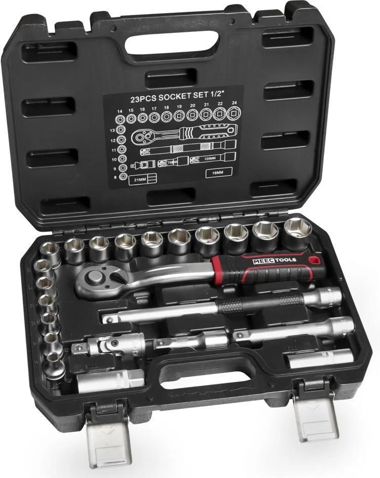 Zestaw kluczy nasadowych z systemem 72-zębowym.Przenośny zestaw kluczy nasadowych marki Meec Tools jest wystarczająco poręczny, aby zabrać go do samochodu lub łodzi. Do 23 elementów ze stali chromowo-wanadowej należą między innymi uchwyt zapadkowy z funkcją szybkiego zwalniania nasadki, przedłużki, przegub uniwersalny i nasadki do świec. Ten zestaw zapewni Ci gotowość do wszystkich prac mechanicznych!Zawiera zestaw 1/2”Zestaw kluczy nasadowych jest dostarczany w walizce z odlewanego tworzywa, a w jego skład wchodzą następujące elementy: 16 nasadek: 8/9/10/11/12/13/14/15/16/17/18/19/20/21/22/24 mm uchwyt zapadkowy z funkcją szybkiego zwalniania nasadki przegub uniwersalny przedłużka 250 mm z osłoną z tworzywa 2 przedłużki: 75 mm i 125 mm 2 nasadki do świec: 16/21 mm 10 lat gwarancjiZestaw kluczy nasadowych, który posłuży wiele lat! Wszystkie elementy zostały wykonane z matowej chromowanej stali chromowo-wanadowej i są objęte 10-letnią gwarancją.