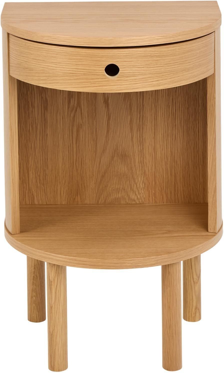 SZAFKA NOCNA PARON DĄB 40X31,5X60 CM Ten stolik nocny wyróżnia się elegancką estetyką, ma półkolistą formę i okrągłe nogi. Posiada szufladę i otwartą przegrodę, może pomieścić drobne niezbędne rzeczy i dekoracje. Jego lakierowany fornir dębowy podkreśla design stolika, akcentując jego naturalny wygląd. Stanowi doskonałe wykończenie sypialni w stylu skandynawskim. Szafka nocna jest częścią serii PARON, która obejmuje szafki nocne stojące i wiszące. Stolik nocny Paron półokrągły, blat matowy dąb lakierowany PU, rama i szuflada matowy dąb lakierowany NC, podstawa matowy dąb lakierowany NC z otwartą przegrodą, 40x31,5x60 cm