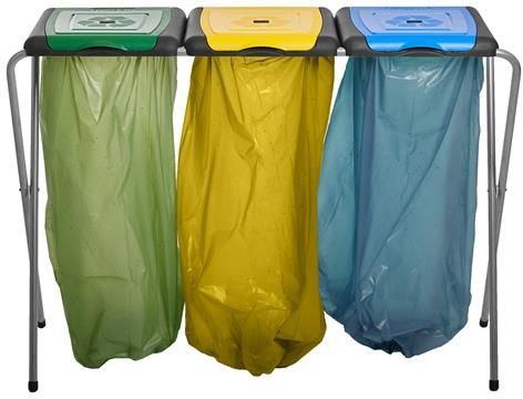 Stojak na worki do segregacji śmieci 3 komorowy Stelaż wykonany z mocnej rurki o średnicy 20 mm w kolorze czarnym Klapa główna wykonana z wysokoudarowego tworzywa sztucznego w kolorze czarnym mocuje się na stelażu każda osobno do której jest WPINANY worek dzięki czemu on nawet napełniony pozostaje …