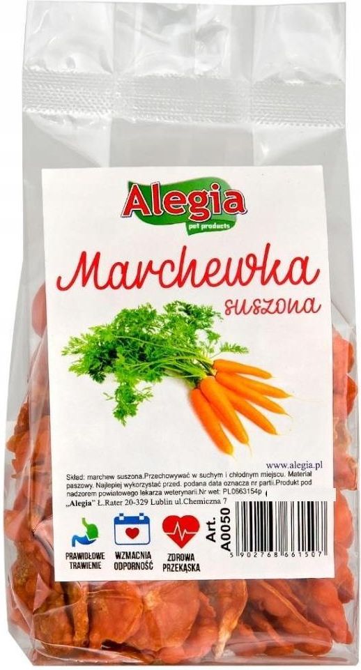 eee.. Co jest doktorku? Bajka Dysney'a udowadnia, że każdy królik nie potrafi się obejść bez marchewki. Jej słodki smak kochają również mniejsze futrzaki, jak np: myszki i chomiki. Oprócz słodkości dostarcza do organizmu sporo witamin. Marchew to doskonałe urozmaicenie diety gryzoni i królików, która dostarcza niezbędnych składników mineralnych i witamin. To w 100 % naturalny, zdrowy przysmak który zawiera prowitaminę A oraz witaminy z grupy B, PP, E, C, K, M, aminokwasy oraz białka. Ponieważ chipsy marchewki wzmacniają układ odpornościowy, wspomagają pracę przewodu pokarmowego, wpływają korzystnie na prawidłowy rozwój mikroflory jelitowej oraz działają przeciwbakteryjnie. Chętnie ten pokarm zje: - królik - świnka morska - chomik (bengalski, syryjski, zabajkalski, chiński) - mysz - szczur - koszatniczka - szynszyla - myszoskoczek Opakowanie: 60g Produkt w 100% naturalny. Nie barwiony, nie pryskany, nie posiada żadnych preparatów czy aromatów lub barwników. Pakowany ręcznie. NatiAnimals – Artykuły akwarystyczne, terrarystyczne i zoologiczne od renomowanych producentów Sklep internetowy NatiAnimals oferuje szeroki wybór artykułów akwarystycznych, terrarystycznych i zoologicznych od uznanych producentów, które zapewnią Twoim zwierzętom optymalne warunki życia oraz doskonałą pielęgnację. Artykuły akwarystyczne – Wszystko, czego potrzebujesz do swojego akwarium W NatiAnimals znajdziesz kompleksowe wyposażenie do akwarium, takie jak filtry, oświetlenie, pokarmy, rośliny oraz ozdoby, które zapewnią idealne warunki dla ryb i innych wodnych zwierząt. Nasze produkty pochodzą od renomowanych marek, gwarantujących najwyższą jakość. Akcesoria terrarystyczne – Zadbaj o swoje egzotyczne zwierzęta Oferujemy również szeroką gamę produktów terrarystycznych, w tym terraria, oświetlenie, systemy grzewcze oraz karmy dla gadów, płazów i innych egzotycznych zwierząt. Nasze akcesoria pomagają w stworzeniu zdrowego i bezpiecznego środowiska dla Twoich podopiecznych. Artykuły zoologiczne – Kompleksowa opieka nad zwierzętami domowymi W NatiAnimals znajdziesz wszystko, czego potrzebujesz dla swoich zwierząt domowych – od karm i suplementów, po akcesoria do pielęgnacji i zabawki. Dzięki produktom od renomowanych producentów możesz zapewnić swojemu pupilowi najlepszą opiekę. NatiAnimals – Twój zaufany sklep dla miłośników zwierząt Odkryj szeroką ofertę artykułów akwarystycznych, terrarystycznych i zoologicznych w NatiAnimals i zapewnij swoim zwierzętom komfort oraz zdrowie. Wybierz sprawdzone produkty od renomowanych marek, które pokochają zarówno Ty, jak i Twoje zwierzaki!