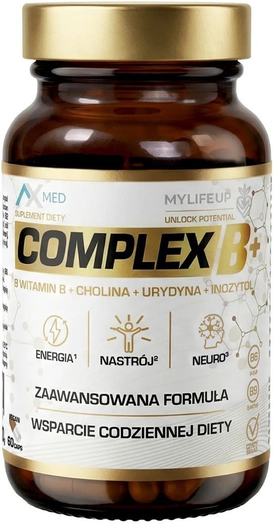 Ax Med Complex B+ - to suplement diety w postaci kapsułek, który zawiera kompleks witamin z grupy B, inozytol i monofosforan urydyny. Produkt przeznaczony dla osób dorosłych. Bez glutenu, bez laktozy. Odpowiedni dla wegan.