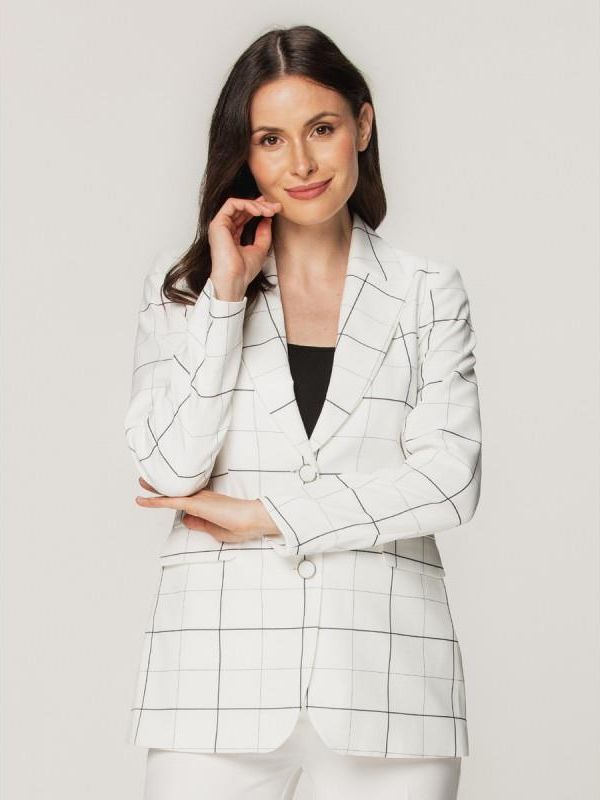 Marynarka damska Willsoor Wybierając elegancką, jednorzędową marynarkę damską marki Willsoor bez wątpienia przekonasz się do noszenia jej nie tylko od święta, ale również na co dzień! Marynarka jest lekka i wygodna, dzięki czemu nawet nie poczujesz, że masz na sobie tak niebywale elegancki strój. Została uszyta z wysokiej jakości materiału o gładkiej fakturze. Materiał jest elastyczny i delikatny w dotyku. Krój wyraźnie podkreśla linię talii. Guziki oraz kieszenie z patkami stylowo uzupełniają nowoczesny design marynarki. Skład tkaniny wierzchniej: 83% poliester, 12% wiskoza, 5% elastan Skład podszewki: 94% poliester, 6% elastan Rodzaj marynarki: jednorzędowa, zapinana na dwa guziki Kolor główny: biała w czarną kratę, guziki obciągane materiałem ze srebrną obwódką Producent: Willsoor Gwarancja: 24 m-ce Uszyto w Polsce