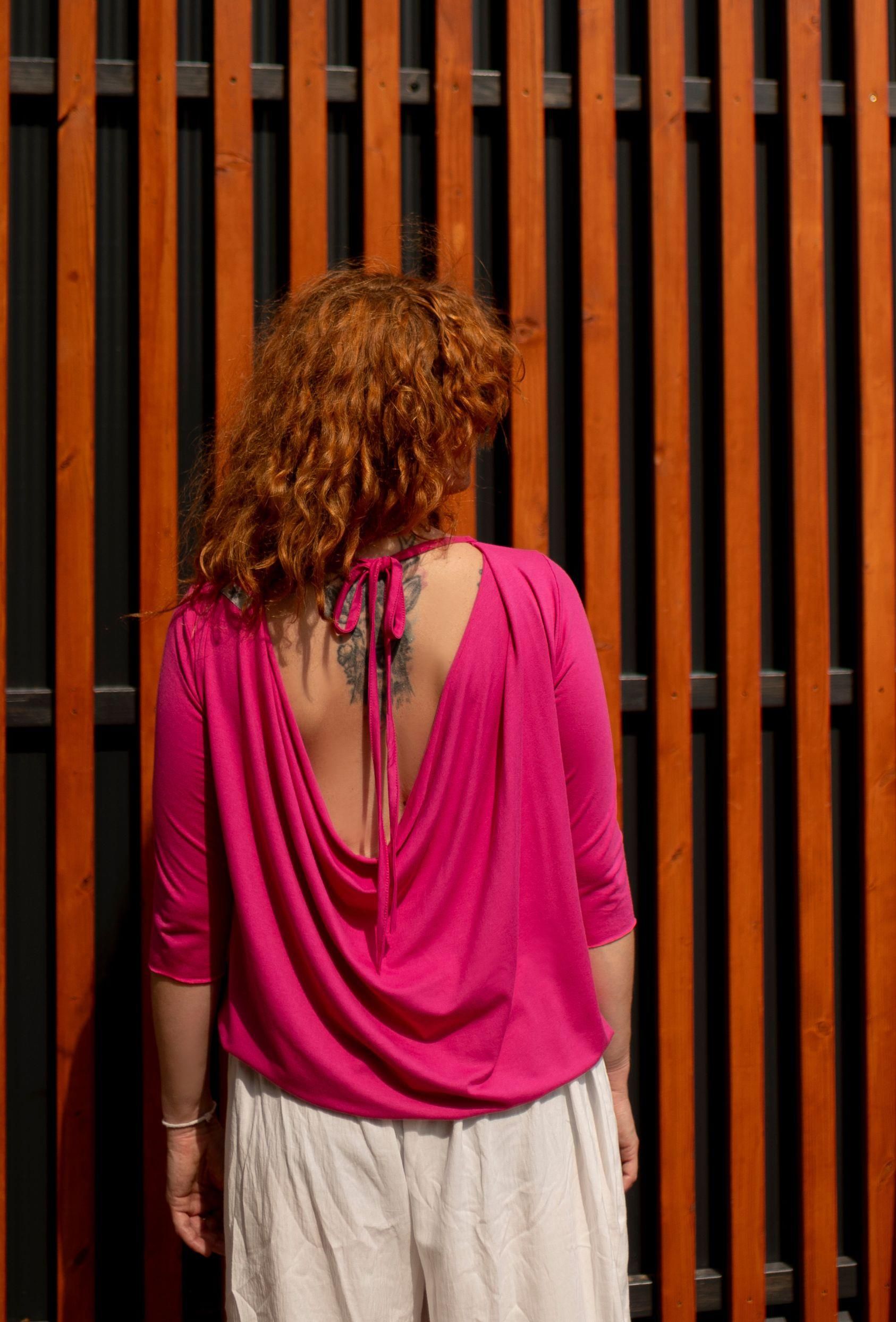 KOLOR: AMARANTOWY Wiskoza 96%, elastan 4% Dzianina wiskozowa z elastanem. GRAMATURA: 190 G/M2 Bluzka z wiskozy z charakterystycznym głębokim dekoltem na plecach, wiązanym i regulowanym za pomocą troczków. Lekko opadający tył nadaje jej wyjątkowego, swobodnego charakteru. Zaprojektowana i uszyta w …