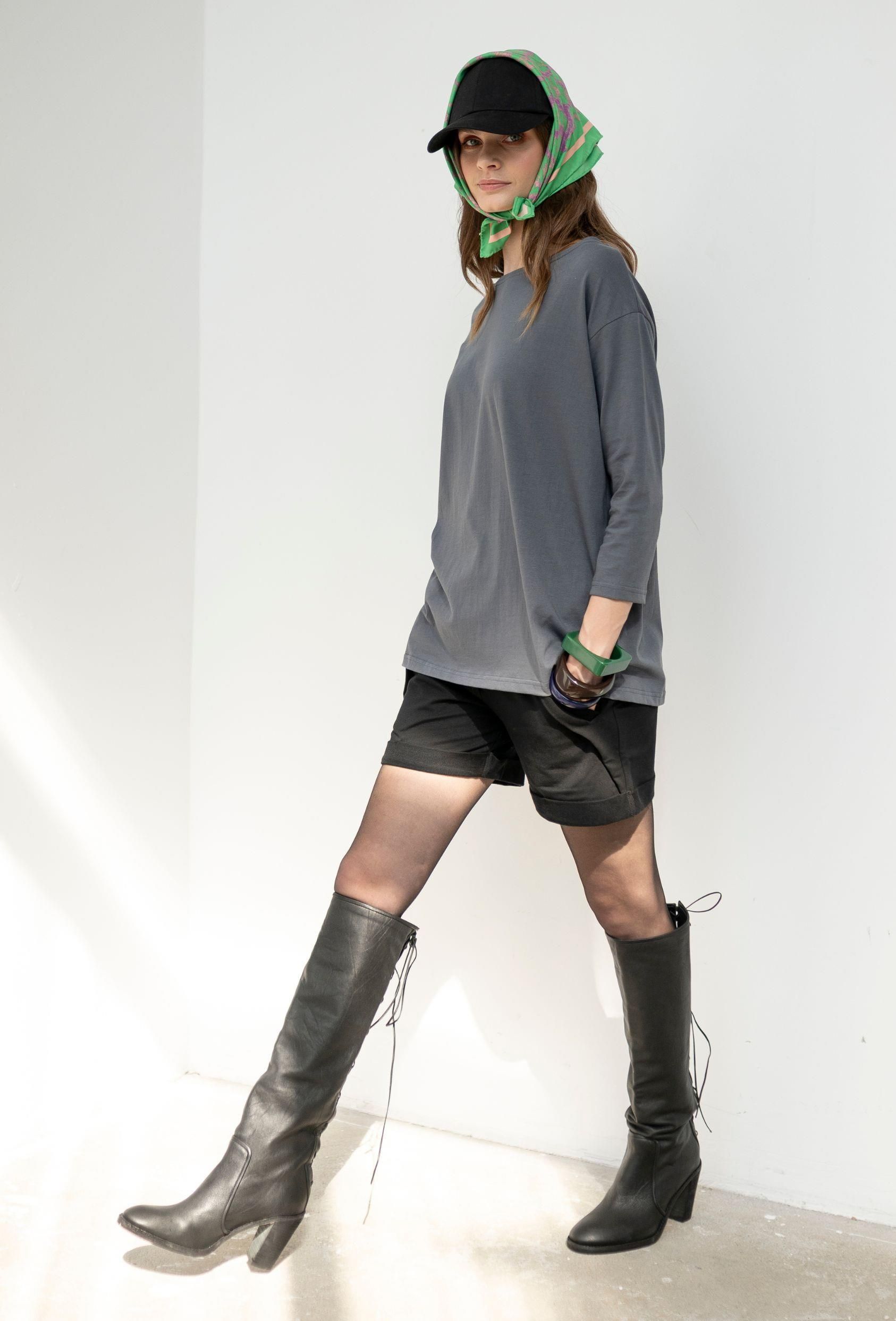 KOLOR: CIEMNY SZARY Bawełna 100% Elastyczna dzianina bawełniana. GRAMATURA: 150 G/M2 Prosty T-shirt z dekoltem w łódkę. Jego minimalistyczny fason pasuje do dresowych spodni, jeansów i prostych spódnic. Zaprojektowany i uszyty w Polsce. • dość wąski rękaw o długości ¾, • dekolt łódka, • prosty, luźny fason, • dół bluzki i rękawy wykończone podwinięciem, • modelka ma 177 cm wzrostu i nosi rozmiar M. Wymiary (w centymetrach, mierzone na płasko): XS: szerokość w biuście 52 cm, szerokość dołu 53 cm, długość rękawa 34 cm, długość całkowita 62 cm, S: szerokość w biuście 56 cm, szerokość dołu 56 cm, długość rękawa 36 cm, długość całkowita 63 cm, M: szerokość w biuście 59 cm, szerokość dołu 61 cm, długość rękawa 39 cm, długość całkowita 66 cm, L: szerokość w biuście 64 cm, szerokość dołu 68 cm, długość rękawa 41 cm, długość całkowita 68 cm.