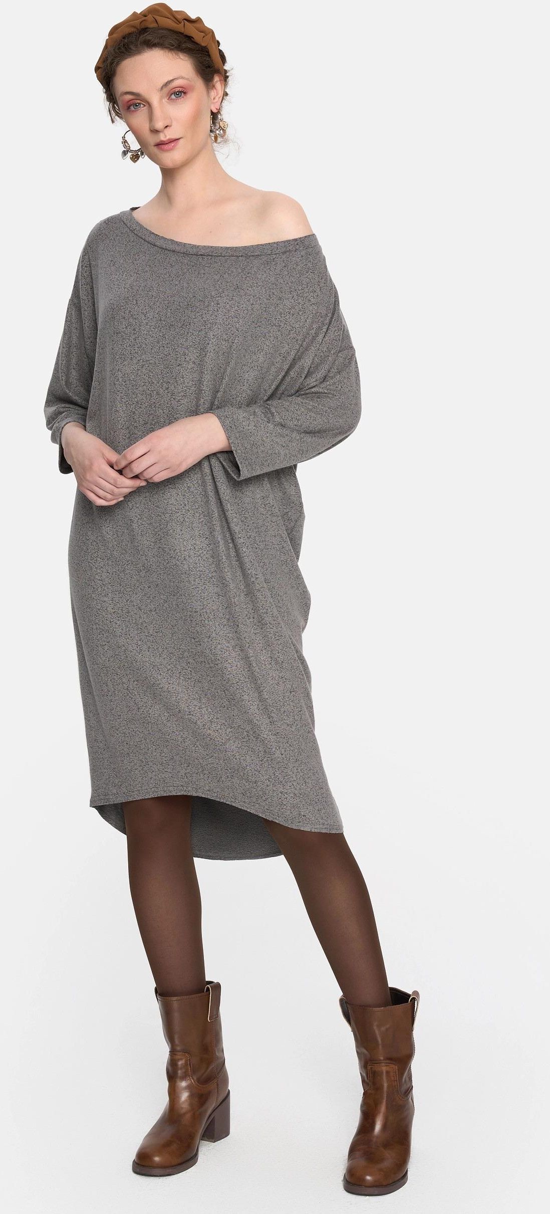KOLOR: CIEMNY SZARY MELANŻ LTD Wiskoza 82%, poliester 12%, elastan 6%. Elastyczna dzianina. GRAMATURA: 200 G/M2 Sukienka oversize o długość midi, wykonana z cienkiej, sweterkowej dzianiny. . Dekolt z ciekawym, podwójnym przeszyciem, w kształcie szerokiej łódki, lekko opadający z ramion. …