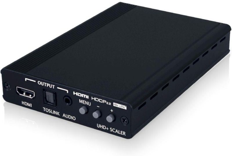 CP-259UHD Skaler HDMI do HDMI.Wspiera rozdzielczości od 640×480@60Hz do 4096×2160p@60Hz (4:4:4, 8-bitowe). Na zamówienie w przeciągu 6-7 dniObsługuje: wiele formatów audio w tym LPCM 2.0/5.1/7.1, Bitstream i HD Bitstream przez HDMI, embedowanie i deembedowanie audio poprzez cyfrowe optyczne wejścia audio i analogowe wejścia stereo audio (tylko LPCM 2.0), konwersja szybkości klatek, adaptacyjny deinterlacing 3D oraz wykrywanie i odzyskiwanie pull-down 3:2/2:2, regulacje wideo dla kontrastu, jasności, barwy, nasycenia, ostrości, poziomów RGB i proporcji obrazu, zintegrowane zarządzanie EDID i HDCP. CP-259UHD Skaler HDMI do HDMI do 4K@60Hz (4:4:4, 8-bit) Dostawa na zamówienie w przeciągu 6-7 dniTen kompaktowy, a jednocześnie wszechstronny Skaler UHD HDMI do HDMI przyjmuje i wyprowadza szeroką gamę rozdzielczości do 4K@60Hz (4:4:4, 8-bitowe) z jednoczesnym osadzaniem i de-osadzaniem audio cyfrowego (HDMI lub optycznego) lub analogowego audio. Zintegrowane opcje zarządzania EDID i HDCP pozwalają na kontrolę sposobu, w jaki podłączone źródła i wyświetlacze wykrywają urządzenie.Wyskalowane wyjście HDMI jest napędzane przez wysokiej jakości silnik skalowania jednoprzebiegowego z możliwością dostosowania obrazu za pomocą wielu opcji dostrajania, w tym: kontrastu, jasności, barwy, nasycenia, ostrości, redukcji szumów i poziomów RGB. Obsługa adaptacyjnego deinterlacingu 3D i konwersji szybkości klatek jest także wspierana.Cechy CP-259UHD Przeskalowane wyjście HDMI wspiera rozdzielczości od 640×480@60Hz do 4096×2160p@60Hz (4:4:4, 8-bitowe) Obsługuje przepuszczanie wielu formatów audio w tym LPCM 2.0/5.1/7.1, Bitstream i HD Bitstream przez HDMI Obsługuje osadzanie i de-osadzanie audio poprzez cyfrowe optyczne wejścia audio i analogowe wejścia stereo audio (tylko LPCM 2.0) Obsługuje konwersję klatkażu, adaptacyjny deinterlacing 3D oraz wykrywanie i odzyskiwanie pull-down 3:2/2:2 Obsługuje regulacje wideo dla kontrastu, jasności, barwy, nasycenia, ostrości, poziomów RGB i proporcji obrazu Zintegrowane zarządzanie EDID i HDCP Sterowanie za pomocą przycisków Panel przedni z kompleksowym OSD