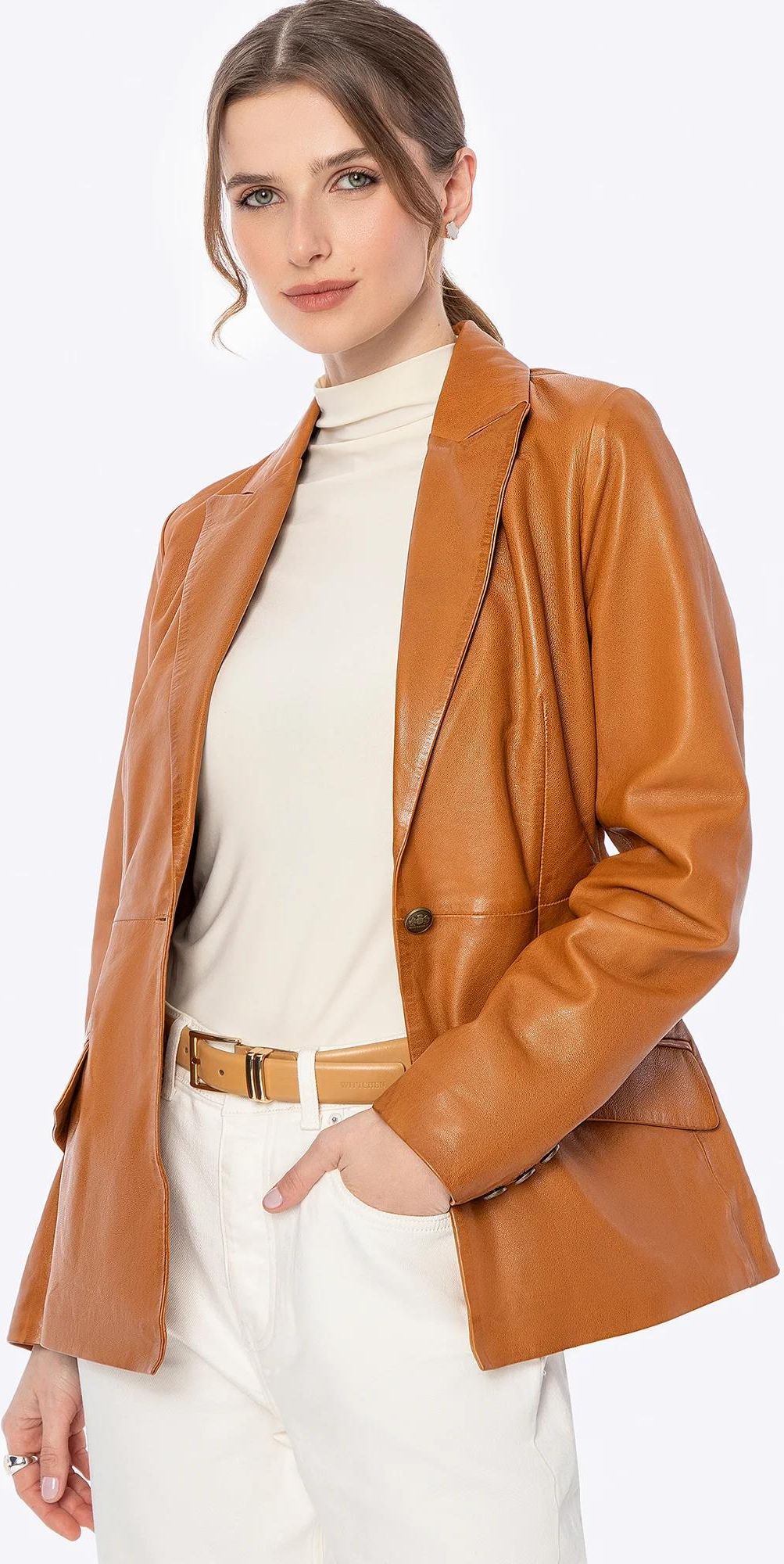 Skórzany płaszcz, który wyznacza nowe standardy elegancji Luksus, który mówi sam za siebie. Ten wyjątkowy krótki płaszcz z naturalnej skóry owczej to kwintesencja ponadczasowego stylu i nowoczesnej elegancji. Każdy detal – od prestiżowych metalowych guzików sygnowanych logo producenta po dopracowany, elegancki fason – został zaprojektowany z myślą o kobietach, które cenią doskonałą jakość i wyrafinowany styl. Taliowany krój pięknie podkreśla sylwetkę, a klasyczny kołnierz nadaje całości wyrafinowanego charakteru. Dla kogo? Jeśli cenisz luksusowe materiały, perfekcyjne dopasowanie i detale, które robią różnicę – ten płaszcz jest dla Ciebie. To propozycja dla kobiet pewnych siebie, które chcą dodać swoim stylizacjom nutę luksusu. Nasza rada: Zestaw go z klasyczną skórzaną torebką na ramię, by podkreślić jego elegancki charakter lub postaw na małą torebkę crossbody, jeśli zależy Ci na nowoczesnej, szykownej stylizacji. Kluczowe cechy: Materiał: Naturalna skóra owcza jest niezwykle miękka, przyjemna w dotyku, a jednocześnie trwała i odporna na upływ czasu. Taliowany krój: Perfekcyjnie dopasowany fason wysmukla talię i podkreśla kobiecą sylwetkę. Klasyczny kołnierz: To ponadczasowy element, który sprawia, że płaszcz doskonale wpisuje się w formalne i casualowe stylizacje. Metalowe guziki z logo: Eleganckie detale, które nadają ekskluzywnego charakteru. Dwie poziome kieszenie z patkami: Stylowe i praktyczne, zapewniają komfort na co dzień. Skład: 100% skóra owcza; podszewka: 100% poliester. Wygodne i funkcjonalne rozwiązania: Komfort noszenia: Gładka, przyjazna dla skóry podszewka z poliestru zwiększa wygodę użytkowania. Rozpinane rękawy na guziki: Możliwość dostosowania długości rękawów za pomocą sygnowanych guzików. To nie tylko płaszcz – to inwestycja w styl, jakość i ponadczasową elegancję. Nie zwlekaj – dodaj go do swojej garderoby i poczuj różnicę, jaką robi perfekcyjnie skrojona skóra owcza!
