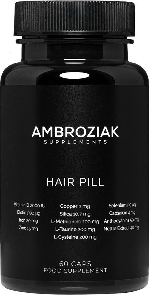 Laboratorium Dr Ambroziak, znane z innowacyjnych rozwiązań w dziedzinie dermatologii i medycyny estetycznej, wprowadza na rynek linię suplementów diety Ambroziak Supplements, zaprojektowaną z myślą o wsparciu zdrowia i piękna od wewnątrz. Hair Pill – suplement wzmacniający włosy, paznokcie i skórę. Biotyna, cynk, miedź i ekstrakty roślinne wspierają zdrowy wzrost włosów, chronią przed uszkodzeniami i poprawiają ich kondycję. Produkt wzbogacono o kapsaicynę, która stymuluje wzrost włosów, oraz L-taurynę, L-metioninę i L-cysteinę, wspomagające odbudowę struktury włosa. Kluczowe składniki Biotyna Biotyna, znana jako witamina piękna, wspiera zdrowie włosów, skóry i paznokci. Pomaga w produkcji keratyny która jest podstawowym budulcem włosów i przeciwdziała ich wypadaniu Cynk i selen Oba minerały pełnią kluczową rolę w utrzymaniu zdrowych włosów i paznokci. Cynk wspiera regenerację komórek, a selen chroni je przed stresem oksydacyjnym, co zapobiega ich osłabieniu i łamliwości. Kapsaicyna Kapsaicyna pobudza mikrokrążenie w skórze głowy, co zwiększa dopływ składników odżywczych do mieszków włosowych, stymulując wzrost mocniejszych włosów. L-tauryna, L-metionina, L-cysteina Te aminokwasy siarkowe są niezbędne dla produkcji keratyny, głównego białka włosów. Wzmacniają strukturę włosów, zwiększają ich odporność na uszkodzenia i przyspieszają regenerację. Ekstrakt z pokrzywy Pokrzywa jest źródłem krzemu i innych mikroelementów, które wspierają wzrost włosów, wzmacniają paznokcie i zapobiegają ich łamliwości. Ma również działanie oczyszczające, które korzystnie wpływa na kondycję skóry głowy. Miedź Miedź pomaga w utrzymaniu prawidłowej pigmentacji włosów, zapobiegając ich przedwczesnemu siwieniu. Wspiera również zdrowie skóry. Poczuj różnicę od wewnątrz! Hair Pill to kompleks składników stworzony z myślą o zdrowych, mocnych włosach, paznokciach i skórze. Produkt zawiera witaminy, minerały, aminokwasy i ekstrakty roślinne, które wspomagają wzrost włosów, poprawiają ich kondycję i zapobiegają wypadaniu. Czysty i sprawdzony skład. Jakość potwierdzona przez ekspertów. Maksymalne bezpieczne stężenie w 1 formule. Sposób użycia Zalecana dzienna porcja do spożycia to 2 kapsułki. Spożywać po posiłku, popijając dużą ilością wody. Ostrzeżenia: Preparat przeznaczony dla zdrowej populacji osób dorosłych do 75 roku życia. Nie należy przekraczać zalecanej porcji do spożycia w ciągu doby. Nie stosować preparatu w przypadku nadwrażliwości na którykolwiek z jego składników. Nie należy stosować suplementu diety po upływie daty minimalnej trwałości. Data minimalnej trwałości znajduje się z boku opakowania. Suplement diety nie może być stosowany jako substytut zróżnicowanej diety. Ulotka informacyjna w opakowaniu. Zaleca się zrównoważony sposób żywienia i zdrowy tryb życia.
