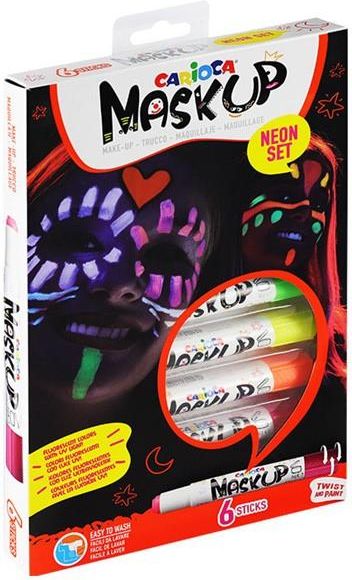 Zestaw 6 kredek do malowania twarzy Maks Up marki Carioca. Świetna zabawa dla całej rodziny. Idealnie sprawdzą się podczas urodzin, festynów, zabaw, jak również imprez sportowych! kredki testowane dermatologicznie miękka konsystencja ułatwia nakładanie nie brudzą rąk dzięki plastikowej obudowie łatwo zmywalne - wystarczy użyć delikatnego mydła zestaw 6 fluorescencyjnych kolorów, które świecą w świetle UV x 6g