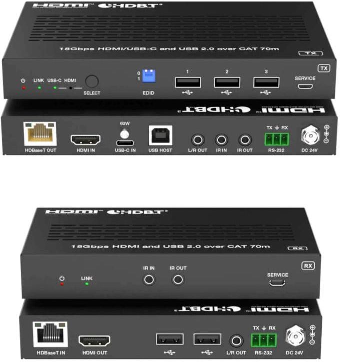Extender (przedłużacz) HDBaseT 3.0 może przesyłać nieskompresowane sygnały HDMI lub USB-C (DP Alt Mode), RS-232, dwukierunkowe IR i sygnały USB2.0 do 70 m (4K30/1080P) lub do 40 m (4K60) za pomocą pojedynczego kabla CAT6A/7. Rozdzielczość wideo wynosi do 4K2K@60Hz YUV 4:4:4.Nadajnik obsługuje wejście HDMI lub USB-C i wyodrębnia na wyjściu L/R OUT sygnał audio stereo analogowyOdbiornik obsługuje wyjście HDMI oraz wyodrębnia na wyjściu L/R OUT sygnał audio stereo analogowyExtender dwukierunkowo przesyła sygnały RS-232 i IR, umożliwia zarządzanie EDID, transmisję sygnału USB2.0 i dwukierunkową funkcję POC (Power over Cable). HDP-EHB70HCU3K Extender HDBaseT 3.0 4K60 (70 m/USB) 18-gigabitowy extender HDBaseT 3.0 może przesyłać nieskompresowane sygnały wideo HDMI lub USB-C (DP Alt Mode), RS-232, dwukierunkowe IR i sygnały USB2.0 do 70 m (4K30/1080P) lub do 40 m (4K60) za pomocą pojedynczego kabla CAT6A/7. Rozdzielczość wideo wynosi do 4K2K@60Hz YUV 4:4:4.DEEMBEDDING Audio:Nadajnik obsługuje wejście HDMI lub USB-C i wyodrębnia na wyjściu L/R OUT sygnał audio stereo analogowyOdbiornik obsługuje wyjście HDMI oraz wyodrębnia na wyjściu L/R OUT sygnał audio stereo analogowyPrzedłużacz obsługuje dwukierunkowe przekazywanie sygnału RS-232 i IR, zarządzanie EDID, transmisję sygnału USB2.0 i dwukierunkową funkcję POC (Power over Cable). Ekstender oferuje najwygodniejsze rozwiązanie do rozszerzania HDMI za pomocą pojedynczego kabla CAT z możliwością dalekiego zasięgu i jest idealnym rozwiązaniem do zastosowań domowych/komercyjnych.☆ Zgodność ze standardami HDMI 2.0b i HDCP 2.2☆ Obsługa przepustowości wideo 18 Gb/s☆ Obsługa rozdzielczości wideo do 4K2K@60Hz (YUV 4:4:4)☆ Obsługa HDR, HDR10, HDR10+, Dolby Vision LLM i HLG (pass-through)☆ Umożliwia skalowanie w dół z 4K na Full HD na wyjściu HDMI bez konwersji ramek☆ Wspiera formaty audio LPCM, Dolby Digital/Plus/EX, Dolby True HD, DTS, DTS-EX, DTS-96/24, DTS High Res, DTS-HD MA, DSD (pass-through)☆ Odległość transmisji do 70 m (4K30/1080P) lub 40 m (4K60) za pomocą pojedynczego kabla CAT6A/7☆ Nadajnik posiada 1x wejście HDMI, 1x wejście USB-C, 1x wyjście HDBT, 1x port USB 2.0 w trybie hosta i 3x port USB 2.0 w trybie device☆ Odbiornik posiada 1x wyjście HDMI, 2x port USB 2.0 w trybie device☆ Przełączanie między sygnałem HDMI i USB-C odbywa się ręcznie lub automatycznie☆ USB-C wspiera DP Alt Mode dla sygnału A/V, dane USB 2.0 i ładowanie do 60 W☆ Każdy port USB-A zapewnia moc do 5V/500mA☆ Zasilanie portów USB-A w nadajniku i odbiorniku zależy od tego czy wykryto połączenie hosta do portu USB host.☆ Obsługa dwukierunkowego zasilania POC (Power over Cable) – gdy TX lub RX otrzymuje zasilanie, drugi koniec nie potrzebuje zewnętrznego źródła zasilania☆ Obsługa deembedingu na dźwięk analogowy 3,5 mm w nadajniku Tx i odbiorniku Rx☆ Zaawansowane zarządzanie EDID☆ Obsługa dwukierunkowego przekazywania sygnału RS-232, dwukierunkowego sterowania sygnałem IR, transmisji sygnału USB2.0☆ Kompaktowa konstrukcja zapewniająca łatwą i elastyczną instalację