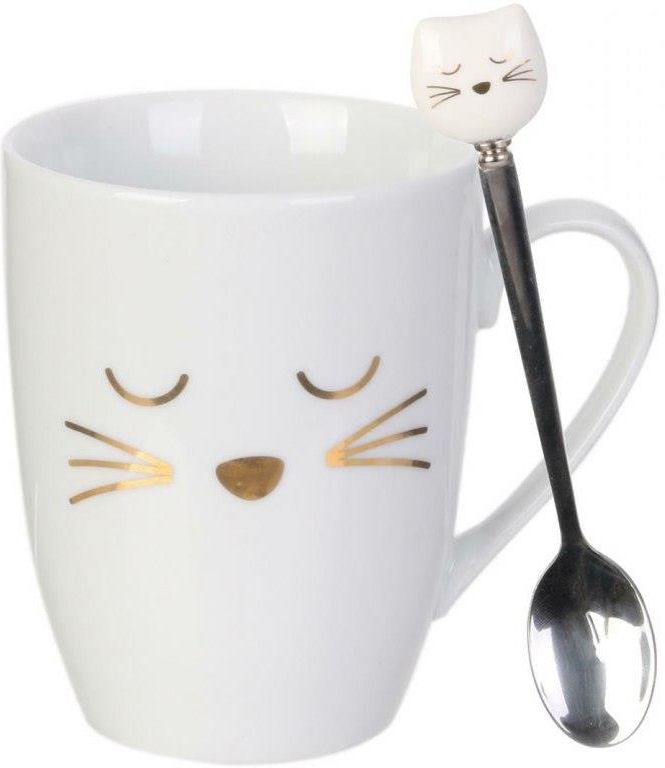 Kubek z kotem z łyżeczką 350ml - | Intesi Ten ceramiczny kubek z łyżeczką jest idealny na śniadanie. Posiada złote zdobienia, które wyglądają jak koci pyszczek, a w zestawie znajduje się metalowa łyżeczka, na której widnieje porcelanowa głowa kota. Kubek zapakowany jest w ozdobne pudełko, co czyni …