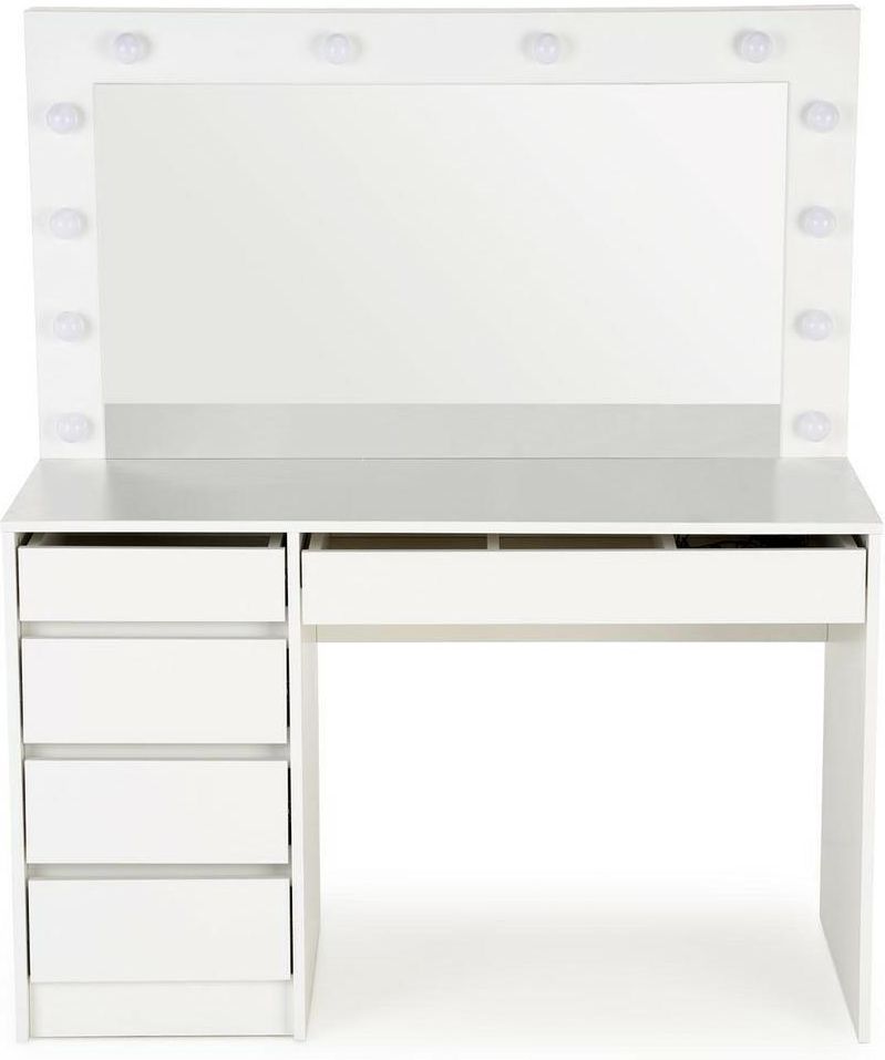 Toaletka z lustrem Sybilla XL biała | Intesi Elegancka toaletka to idealne rozwiązanie dla tych, którzy pragną połączyć funkcjonalność z estetyką. Jej wymiary, wynoszące 120 cm szerokości, 55 cm głębokości i 140 cm wysokości, zapewniają odpowiednią przestrzeń do codziennej pielęgnacji. Wykonana z wysokiej jakości płyty meblowej okleinowanej w białym kolorze. Oświetlenie LED umieszczone na krawędzi lustra dostarcza doskonale rozproszone światło, dzięki czemu wykonywanie makijażu czy golenie staje się prostsze i bardziej precyzyjne. Pięć pojemnych szuflad pozwala na przechowywanie kosmetyków i innych niezbędnych przedmiotów, utrzymując porządek wokół toaletki. Toaletka Sybilla to nie tylko mebel praktyczny, ale również stanowi designerską ozdobę w każdej sypialni czy łazience. Jej harmonijny wygląd oraz funkcjonalność sprawiają, że staje się ona niezastąpionym elementem każdego domowego wnętrza, spełniając oczekiwania nawet najbardziej wymagających użytkowników. O tym warto pamiętać! Jest to mebel przeznaczony do codziennej pielęgnacji, zintegrowany z lustrem, który ułatwia wykonywanie makijażu, golenia czy układania fryzury. Na krawędzi lustra zainstalowano oświetlenie LED, które zapewnia równomierne i miękkie światło. Mebel posiada pięć szuflad, które oferują wystarczającą pojemność na przechowywanie kosmetyków, akcesoriów do pielęgnacji oraz innych niezbędnych przedmiotów. W toaletce znajduje się duże lustro, które pełni zarówno funkcję użytkową, jak i dekoracyjną, odbijając światło i powiększając optycznie przestrzeń.