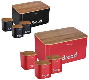 CHLEBAK METALOWY KingHoff KH 1085 , 1086 Cechy: łatwy w utrzymaniu czystości, wytrzymały i odporny na uszkodzenia, funkcjonalny i estetyczny, element w Twojej kuchni produkt nowy i nie używany zapakowany w oryginalne pudełko, w zestawie pojemniki na cukier, herbatę, kawę, wygodne otwieranie zapewnia łatwy dostęp. (Występuje w kilku odcieniach koloru. Po dokonaniu zakupu proszę o informacje jaki kolor został wybrany) Widok całego zestawu Czerwony KH 1085 Czarny KH 1086