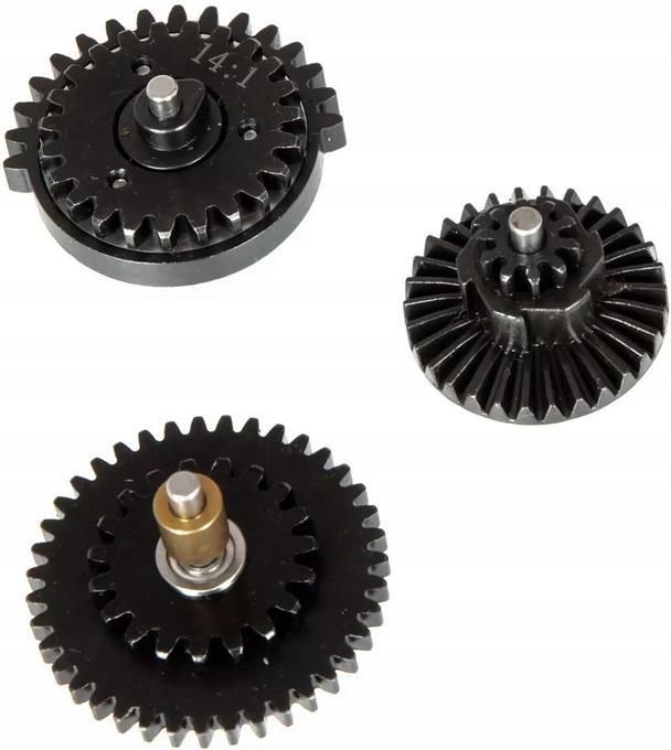 Komplet kół zębatych do tuningu replik airsoftowych. Wykonane są ze stali przy użyciu precyzyjnych maszyn CNC. Przełożenie zębatek to 14:1.