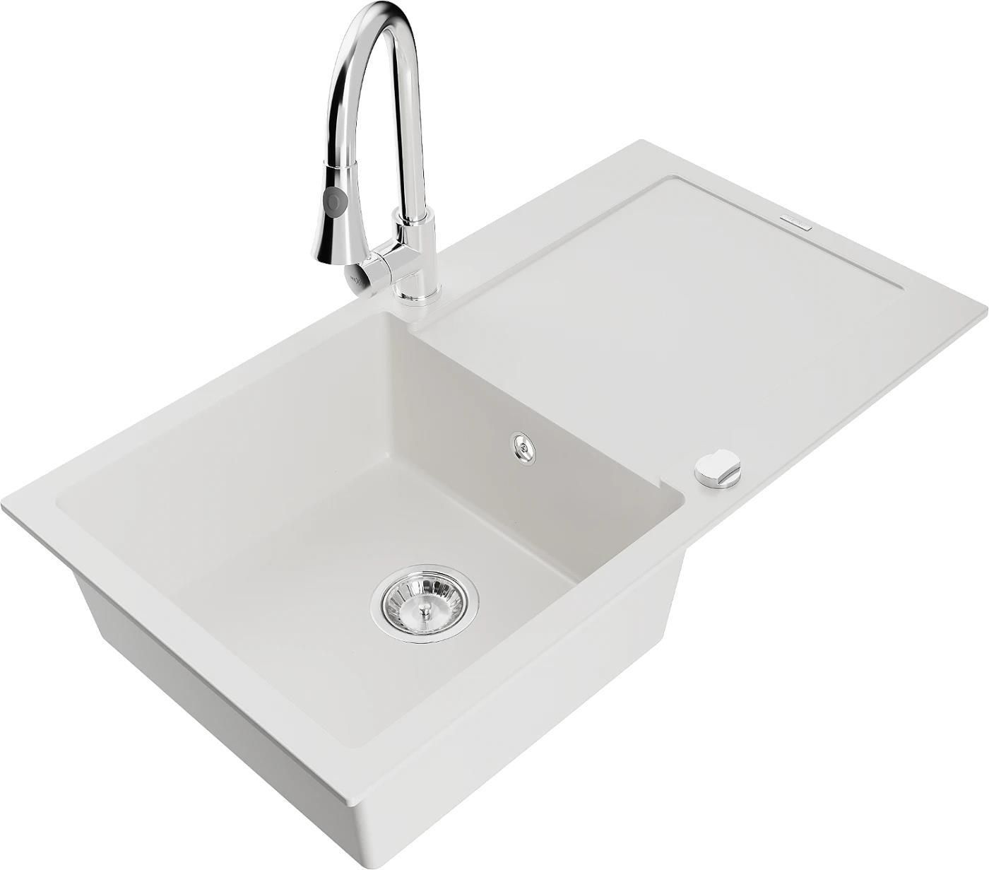 Mexen Leo zlewozmywak granitowy 1-komorowy z ociekaczem i baterią kuchenną Elia, biały - 6501-20-670101-00 Dane produktu Producent: Mexen Nr katalogowy: 6501-20-670101-00 Kod EAN: 5905315027139 Cechy produktu Seria: Leo Dłuższy bok: 900 mm Krótszy bok: 500 mm Typ: Wpuszczany Kształt: Prostokątny Wyciągana wylewka: Tak Wysokość baterii: 38 cm Zasięg wylewki: 25,2 cm Możliwość podłączenia filtra wody: Nie Ilość komór: 1-komorowy Otwory: 2 Podcięcia pod otwory: 2 Ociekacz: Długi ociekacz Syfon automatyczny: Tak Przelew: Tak Kolor syfonu: Chrom Kolor zlewu: Biały Kolor baterii: Chrom Dane techniczne: Zlewozmywak: Rozmiar: 900x500x190 mm Głębokość komory: 180 mm Wymiary komory: 430x415 mm Średnica odpływu: ø90 mm Typ: 1-komorowy z ociekaczem Rodzaj: Wpuszczany w blat Kolor: Biały Wykończenie syfonu: Chrom Materiał: Granit (80% kruszywo granitowe 20% żywice) Otwór przelewowy: Tak Otwory: ( bateria, automat ) 2 Montaż: Uniwersalny, możliwość montażu z ociekaczem po lewej lub prawej stronie Wysoka odporność na zarysowania i przebarwienia Odporność na szok termiczny Powierzchnia ułatwiająca czyszczenie Dwa dodatkowe podfrezowane otwory do samodzielnego wybicia ø35 Bateria kuchenna: Materiał: Mosiądz Kolor: Chrom Głowica: Ceramiczna Perlator: Tak Typ: Jednouchwytowa Wysokość baterii: 380 mm Zasięg wylewki: 252 mm Rodzaj wylewki: Wyciągana