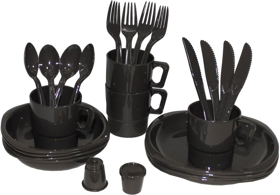 Niezbędnik MFH kampingowy składany w pokrowcu (33345) to produkt wyprodukowany przez niezwykle solidną firmę MFH, dla najbardziej wymagających użytkowników. Niezbędny, przydatny zestaw campingowy, który znajdzie swoje zastosowanie w każdych warunkach. Idealny dla fanów survivalu i wypraw outdoorowych. Zestaw turystyczny MFH 26-częściowy zawiera komplet naczyń obiadowych i sztućców dla 4 osób. Wszystkie elementy zestawu wykonano z wytrzymałego, nietłukącego tworzywa dopuszczonego do kontaktu z wodą i żywnością. Naczynia są przeznaczone do ciepłych i zimnych posiłków. W zestawie znajdują się duże talerze obiadowe, talerze głębokie, kubki z uchwytem oraz pełnowymiarowe sztućce tj. łyżki, widelce oraz ząbkowane noże. Nie zapomniano także o małych, ale istotnych dodatkach czyli pojemnikach na sól i pieprz. Zestaw posiada wojskową specyfikację oraz gaszoną kolorystykę. W zestawie: 4 duże talerze 215 × 20 mm 4 głębokie talerze 170 × 30 mm 4 noże ząbkowane o długości 190 mm 4 widelce o długości 180 mm 4 łyżki o długości 165 mm 4 kubki o pojemności 200 ml solniczka pieprzniczka