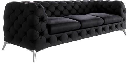%description% WYMIARY Szerokość: 243 cm Głębokość: 100 cm Wysokość: 73 cm Wysokość siedziska: 45 cm Głębokość siedziska: 57 cm TKANINY Aksamit Riviera KOLOR PODSTAWY czarny chrom złoty Obszerna pikowana sofa 3-osobowa - Chesterfield Chelsea Czarny Marzy Ci się stylowo i zarazem przytulnie urządzony …