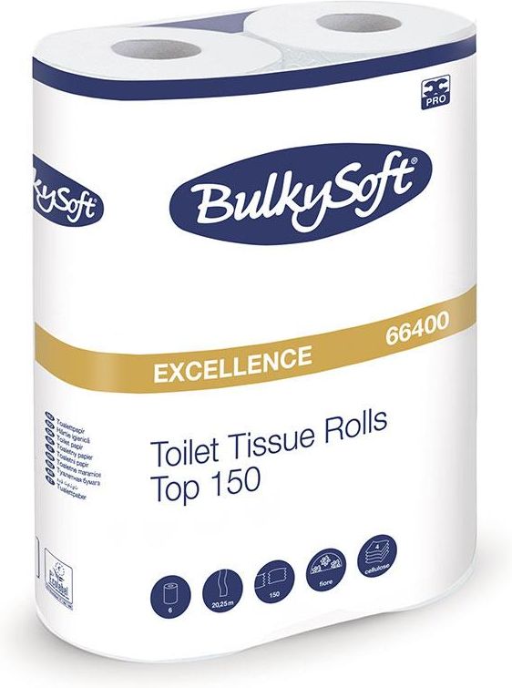 Numer artykułu: 66400BULKYSOFT papier toaletowyKolor: BiałySurowiec: CelulozaIlość warstw: 4Ilość listków: 150Długość rolki: 20,25 mŚrednica rolki: 11,80 cmIlość rolek w opakowaniu: 60Papier toaletowy w rolkach Bulkysoft Excellence to ekskluzywny, elegancki i komfortowy produkt o najwyższej jakości. Wyróżnia go śnieżnobiały kolor i eleganckie gofrowanie. Złożony jest aż z czterech warstw papieru, wykonanego z czystej, wyselekcjonowanej celulozy. Papier jest wyjątkowo miękki, miły w dotyku, chłonny i bardzo wytrzymały. Jest uzupełnieniem łazienek, w których kluczową kwestią jest higiena oraz prestiż. Stanowi idealne rozwiązanie dla hoteli i eleganckich toalet. Opakowanie zbiorcze zawiera 60 rolek.