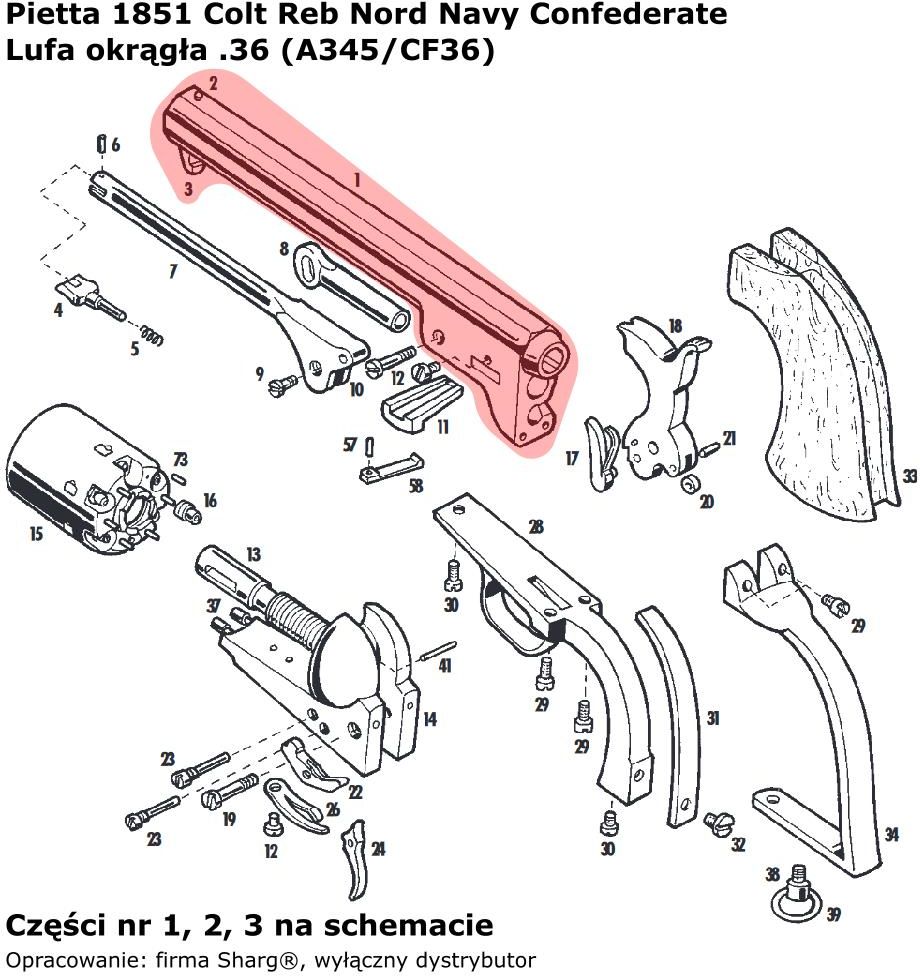 A345/CF36 (serwis) lufa gwintowana kal. .36 do rewolweru czarnoprochowego 1851 Colt REB Nord Navy Confederate firmy Pietta. Okrągła o dług 7.5", oksydowana na czarno. Wyposażona w przyrządy celownicze, front sight (#404) i mocowanie dźwigni stempla (#676)